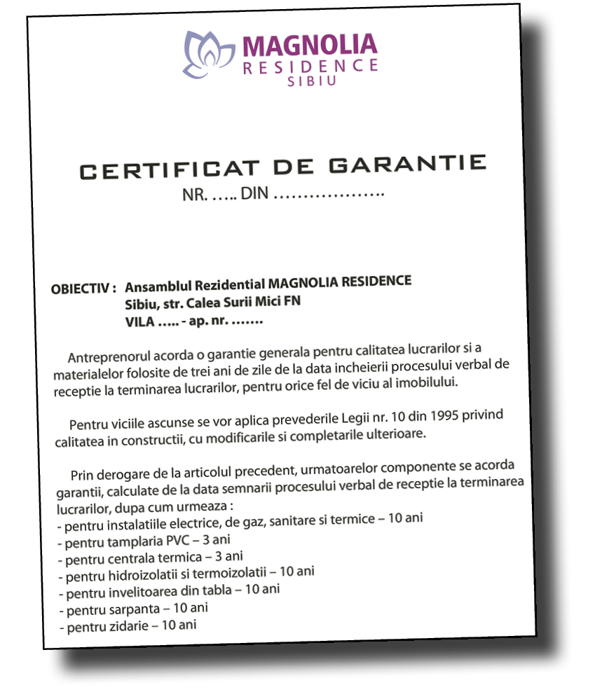 Magnolia Residence Sibiu este un etalon pe piaţa imobiliară din Sibiu, cu principii și standarde de calitate dobândite în proiectele anterioare, cu ani de experienţă și garanţia seriozităţii. Au oferit, celor peste 530 de familii, care și-au dorit, o locuinţă ce se încadrează perfect în etichetele modernismului și, cel mai important, oferă clienţilor toate facilităţile unui apartament călduros și economic într-o zonă liniștită și aerisită a Sibiului cu acces facil către zona centrală.