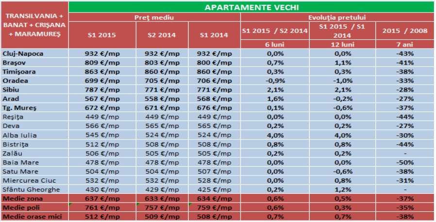La nivel naţional, în decursul ultimelor 12 luni, scăderea prețurilor pentru apartamentele vechi a fost sub 1%, iar în ultimele şase luni s-a înregistrat un uşor reviriment. Față de perioada de început a crizei (anul 2008), preţurile apartamentelor vechi au scăzut însă cu aproximativ 40% la nivel național, iar la Sibiu scăderea este în medie cu 28%.