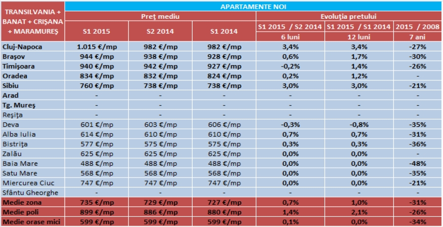 O creștere a prețurilor cu 3% față de anul 2014 se observă în Sibiu pentru apartamentele noi. Construite de regulă mai departe de centru, prețul acestora este mai mic decât al celor vechi, media de vânzare fiind de 760€/mp. Astfel, imobilele cu două camere din zona Hipodrom/Ștrand II au fost vândute cu prețuri între 38.000 și 56.000 €, cele din zona Turnișor/Terezian cu prețuri între 35.000 și 55.000 €, iar cele din zona Lazaret cu prețuri între 28.000 și 40.000 €. Prețul apartamentelor noi din Sibiu se menține mai scăzut decât media pe țară, care este de 779 €/mp și mult mai mic decât media de vânzare înregistrată în marile orașe, aceasta fiind de 909€/mp. Bucureștiul conduce în clasamentul orașelor cu cele mai mari prețuri la apartamentele noi ( 1.137 €/mp), urmat de Cluj-Napoca (1.015 €/mp), Iași (954 €/mp) și Brașov ( 944 €/mp), cele mai mici prețuri înregistrându-se în Baia Mare ( 488 €/mp), Satu Mare (568 €/mp) și Bistrița (577 €/mp).