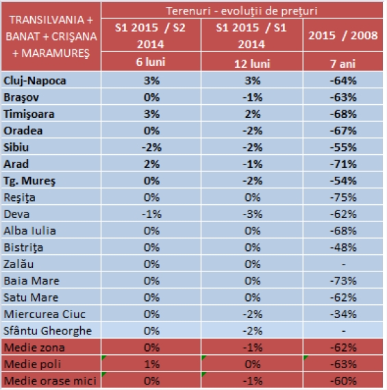 La Sibiu, prețurile terenurilor în primul semestru al anului 2015 sunt mai mici cu 2% față de anul 2014. Singurele orașe din țară unde se înregistrează creșteri la prețul terenurilor sunt Cluj și Timișoara ( 3%) și Arad (2%). În zonele ultrcentrale din Sibiu, terenurile s-au vândut cu prețuri cuprinse între 350 și 620 €/mp, iar cele situate în zone periferice, însă cu perspectivă de dezvoltare, cu prețuri între 10 și 22€/mp. Față de anul 2008, prețul terenurilor s-a redus cu 55% în Sibiu, iar la nivelul întregii țări, prețurile au scăzut în medie cu 61%.