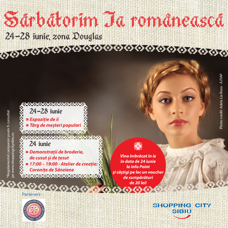 În perioada 24 – 28 Iunie la Shopping City Sibiu sărbătorim IA românească. Ii de sărbătoare, ii cu poale și fără poale, ii cu altită separata și mâneca lungă, ii brodate, ii cu mărgele, ii cusute pe pânză de casă, cămăși încrețite la gât, vor putea fi admirate în cadrul expoziției organizate în zona Douglas.