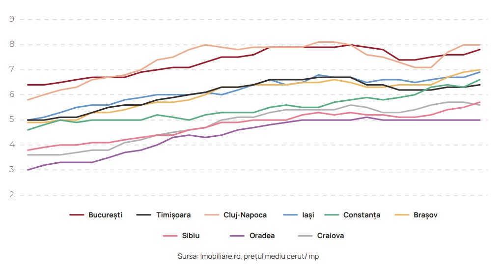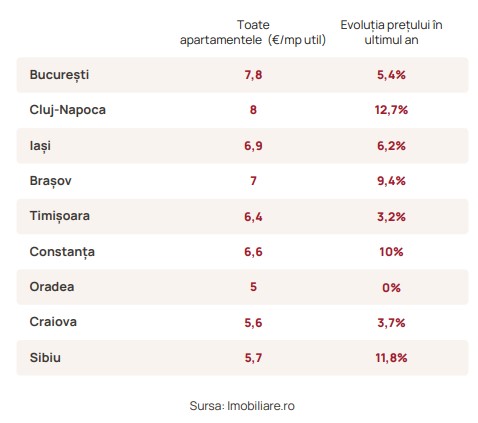 În același timp, chiria pentru locuințele din Sibiu a crescut în ultimul an, după cum reiese din cea mai recentă analiză de piață realizată de imobiliare.ro, pe baza prețurilor din piață. Valoarea chiriei pe metrul pătrat a crescut de la sub 4 euro, la aproape 6 euro, în ultimul an, ceea ce se traduce prin chirii care au crescut de la sub 220 de euro pentru un apartament de 55 mp, la una care se apropie de 400 de euro lunar.
