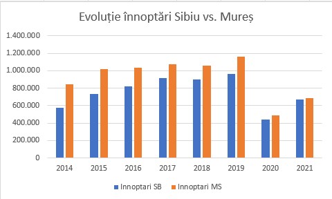 Numărul de înnoptări turistice din județul Sibiu a depășit, în a doua jumătate a anului 2021, în premieră, valorile similare ale județului rival, Mureș, care de foarte mulți ani domină duelul dintre cele două județe, în special cu ajutorul orașului Sighișoara. Și la numărul de turiști, ultimii doi ani au adus un avantaj pentru Mureș.