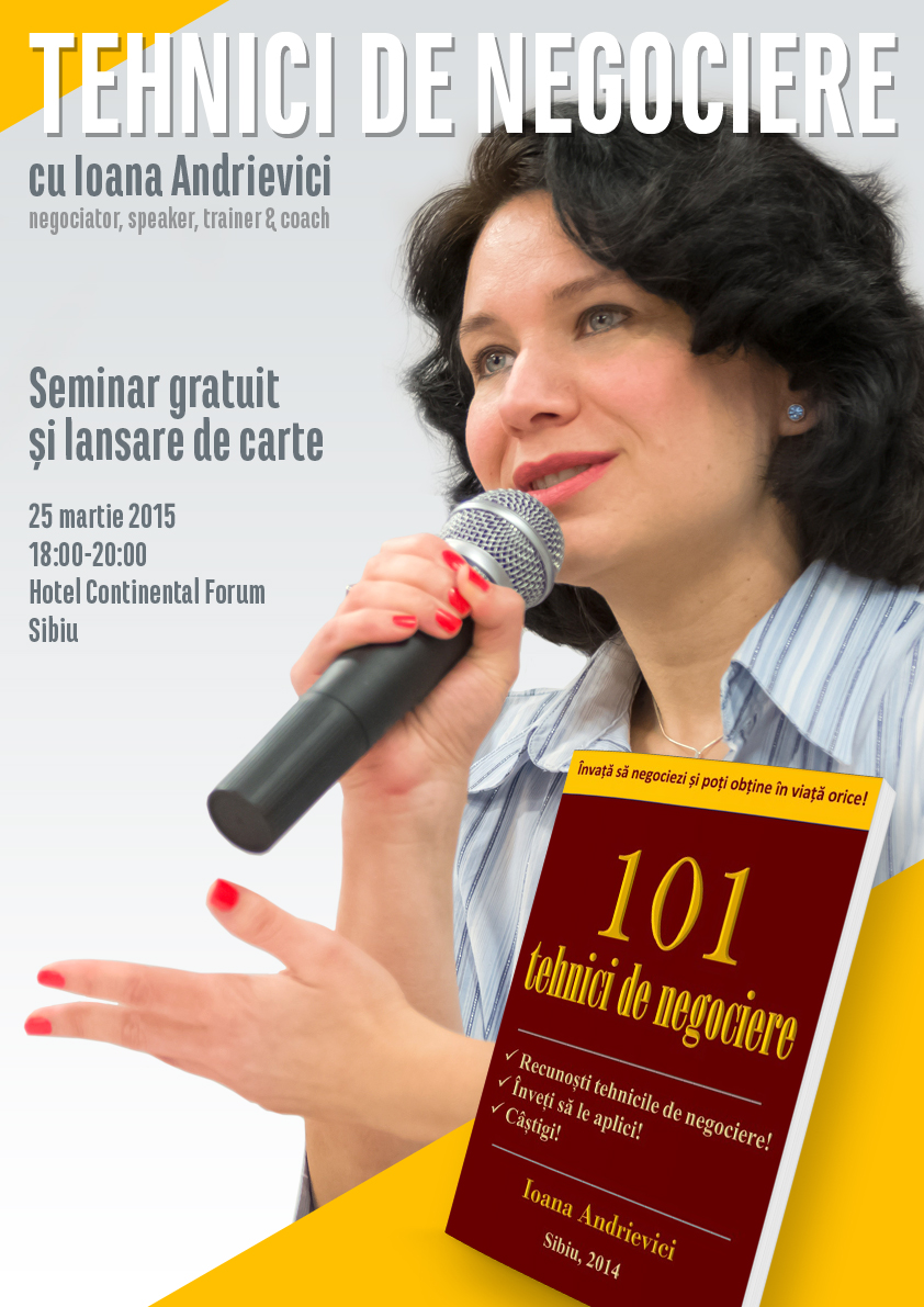 Sibienii interesați de domeniul negocierii sunt invitați la un seminar gratuit susținut de Ioana Andrievici, negociator, speaker, trainer și coach. Evenimentul are loc în data de 25 martie, între orele 18:00 și 20:00, la Hotel Continental Forum Sibiu. Intitulat „Tehnici de negociere”, cei prezenți la seminar vor afla timp de 2 ore de ce este important să știi să negociezi și cum abilitățile de negociere te ajută concret în viață, ce te împiedică să negociezi bine, cum să negociezi cu succes, ce sunt tehnicile de negociere, cum le poți aplica și cum le poți recunoaște și cum să construiești strategii de negociere de tip win-win, un tip de negociere în care fiecare se concentrează pe realizarea unui acord final faborabil, câștigător atât pentru sine, cât și pentru cealaltă parte. În cadrul seminarului va avea loc și lansarea cărții „101 tehnici de negociere”, scrisă de Ioana Andrievici. Locurile sunt limitate, iar înscrierile se fac pe site-ul: www.ioana-consult.ro
