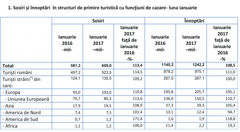 Sosirile înregistrate în structurile de primire turistică în luna ianuarie 2017 au însumat 659.000, 79,4% dintre turiști fiind români. În ceea ce priveşte turiștii străini care au intrat în țară, cea mai mare pondere au deţinut-o cei din Europa (76 % din total turişti străini), iar din aceştia 78 % au fost din ţări ale Uniunii Europene.