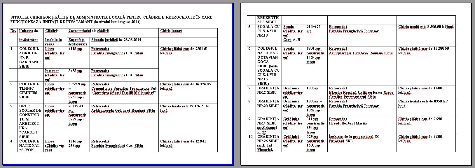 Mai jos vă prezentăm tabelul cu imobilele retrocedate și pentru care Primăria platește chirie. Click pe poza pentru tabel.