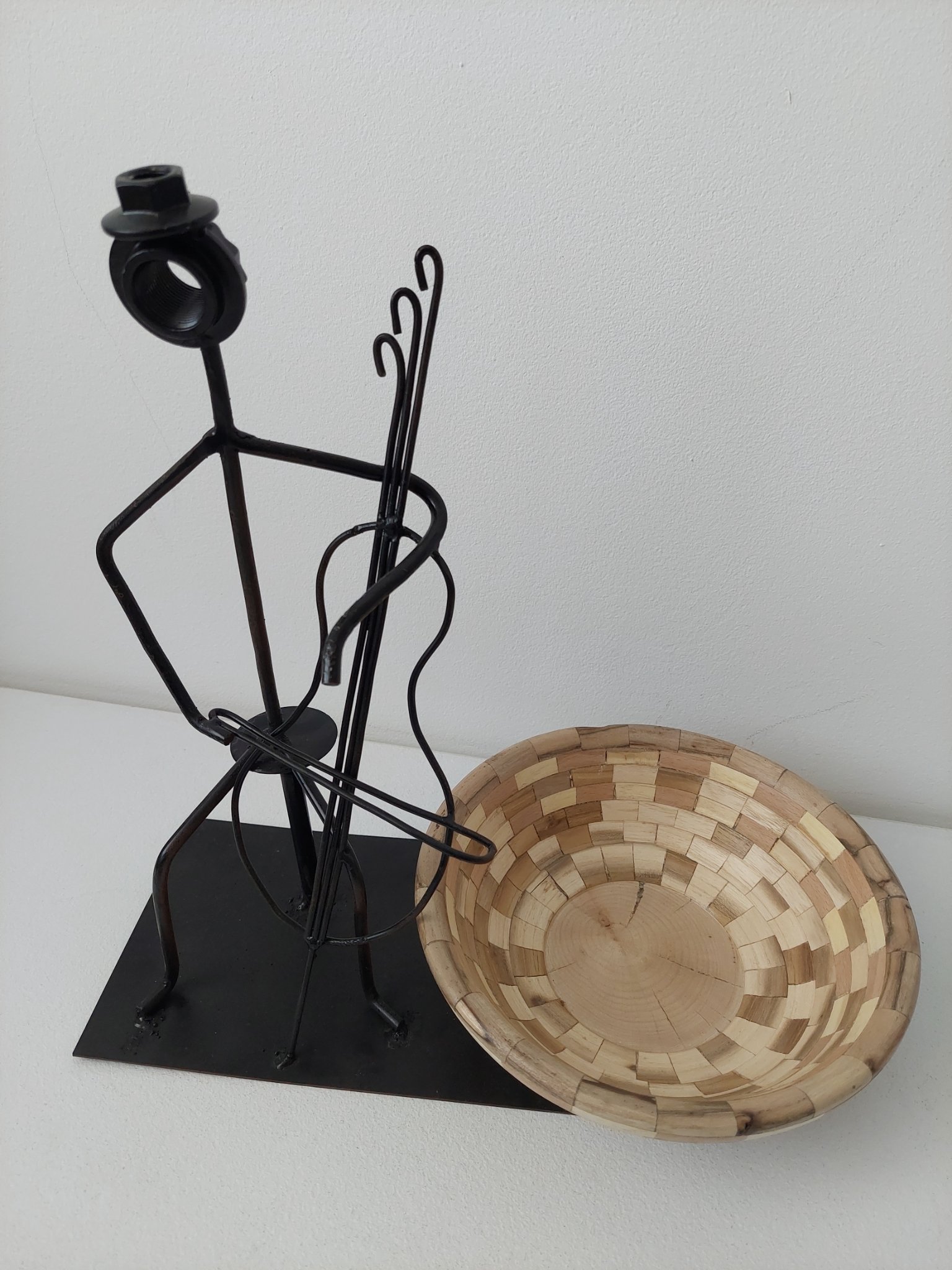 Exponat artist lucrat din sârmă modelată prin îndoire, piulițe uzate, plăcută din tabla, toate elementele asamblate prin sudare, șlefuire și vopsire.