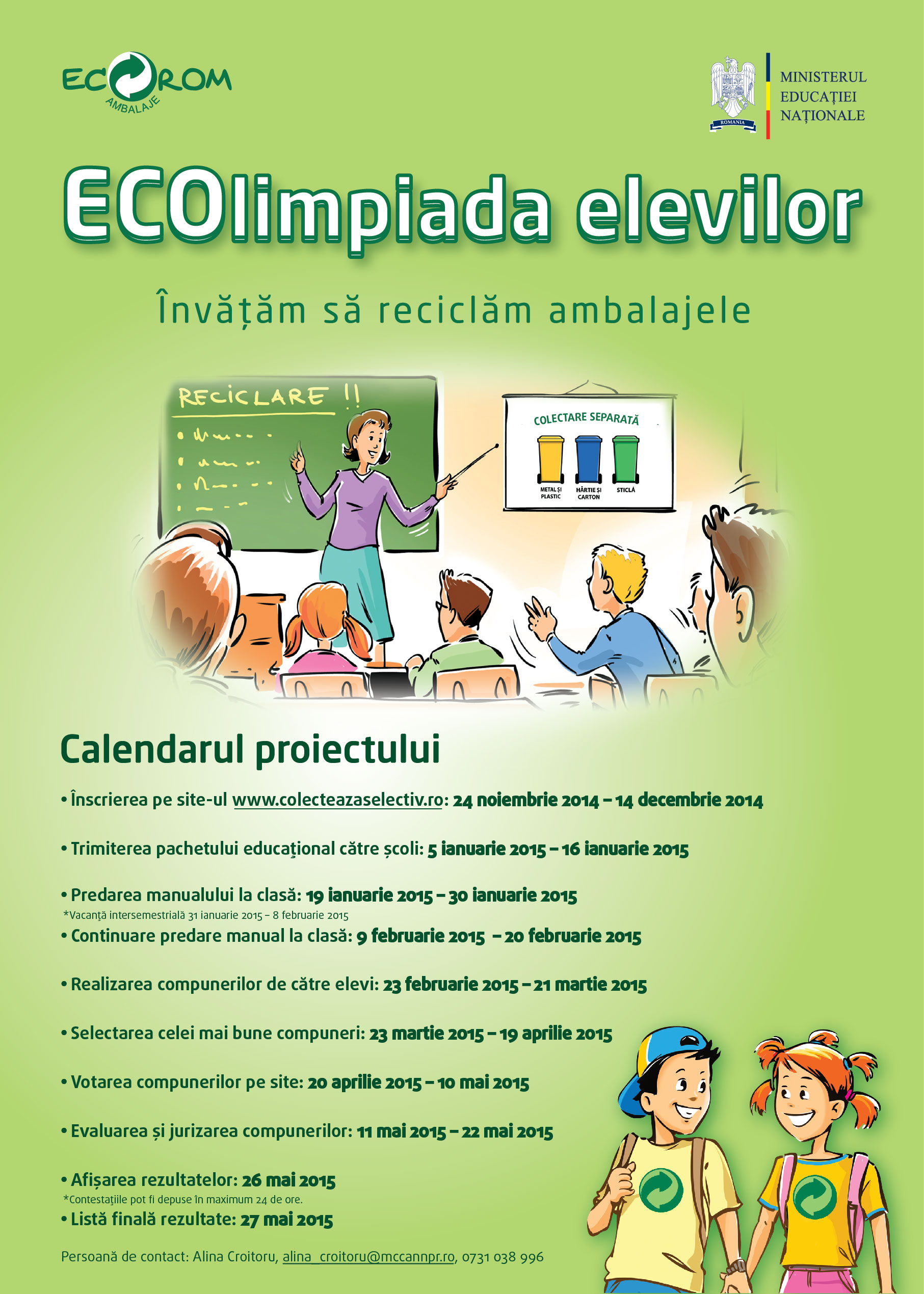 Programul educațional ECOlimpiada elevilor se desfășoară la nivel național încă din 2012 și își propune familiarizarea elevilor din clasele a III-a cu procesul de colectare separată a deșeurilor de ambalaje și cu cel de reciclare.