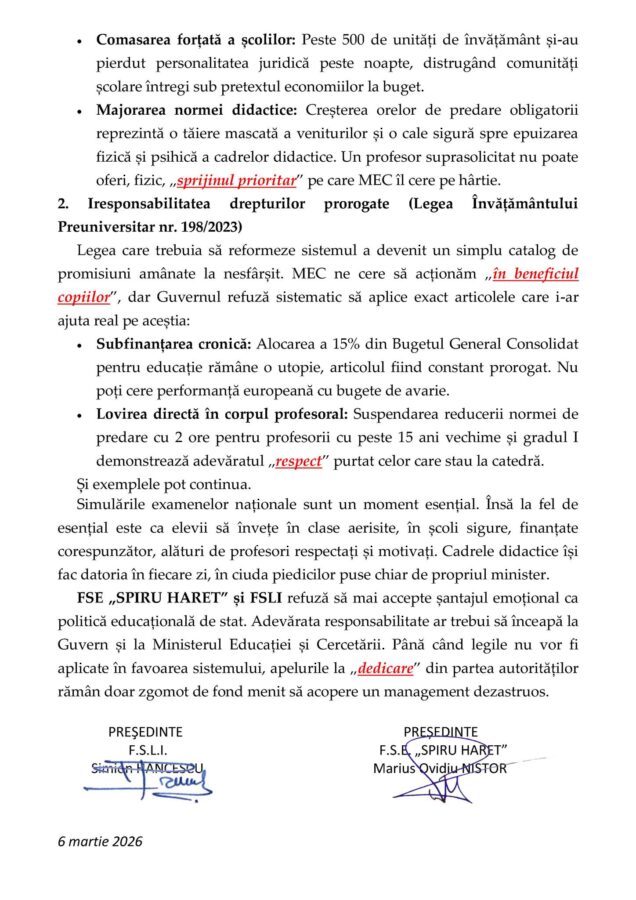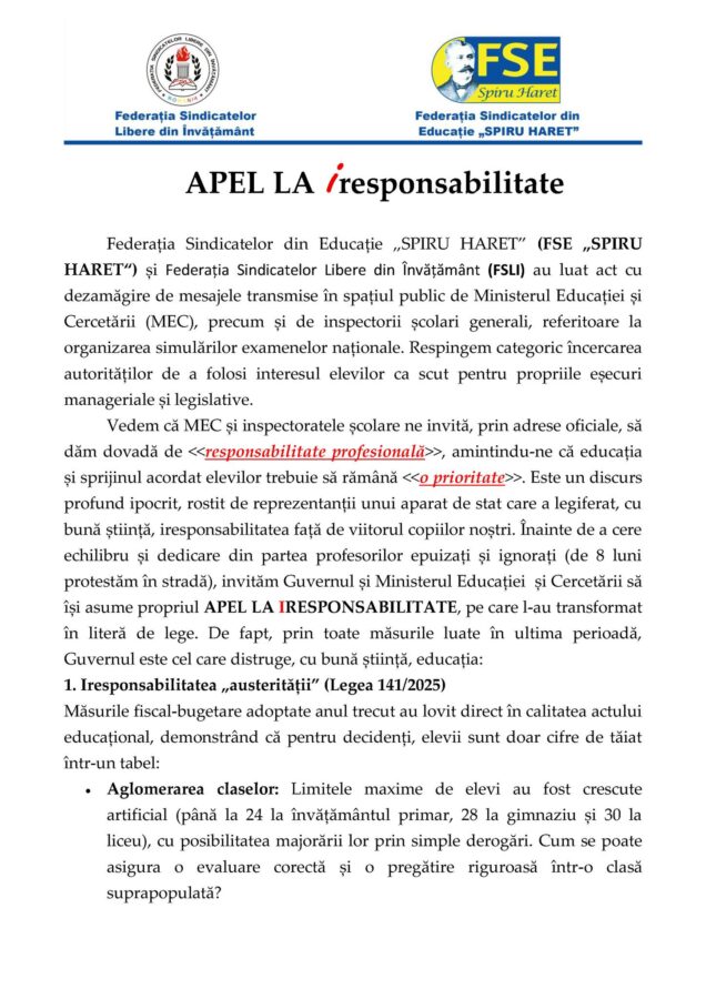 „Federațiile FSE „Spiru Haret” și FSLI resping categoric încercarea Ministerului Educației (MEC) de a folosi interesul elevilor ca scut pentru propriile eșecuri.