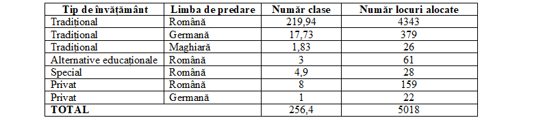 La nivelul județului Sibiu, au fost aprobate 256,4 clase pentru un număr estimativ de 5.018 elevi.