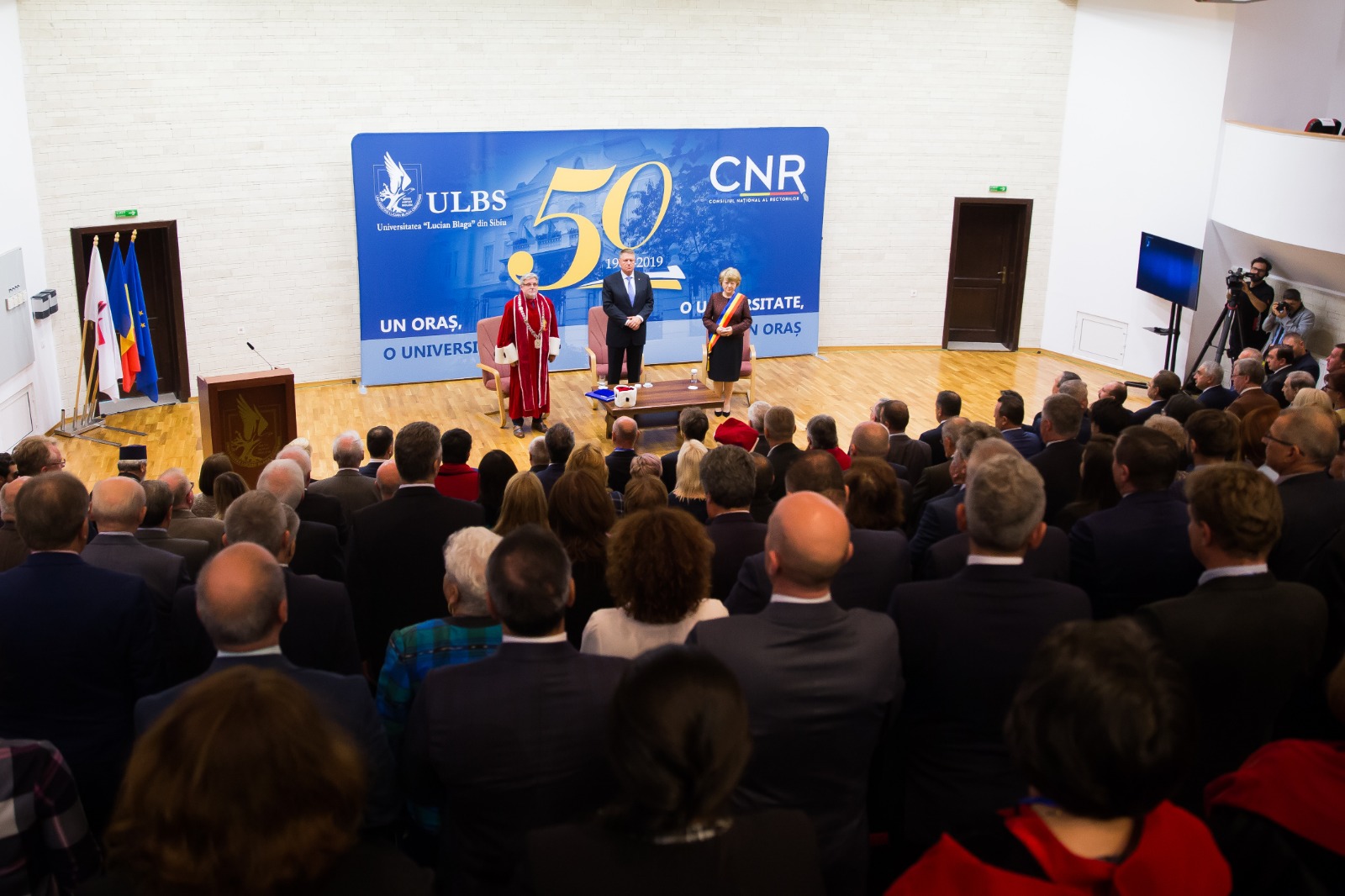 „Cei 50 de ani înseamnă un drum sinuos, cu dificultăți și succese, cu provocări și împliniri. Este rodul eforturilor depuse de-a lungul anilor de toți cei care au făcut parte din corpul de conducere, corpul profesoral și administrativ. Cei care au trecut pragul facultăților noastre au găsit aici dascăli care s-au dovedit a fi adevărați îndrumători spirituali, surse de cunoaștere, dar și de umanitate”, a mai spus rectorul ULBS.