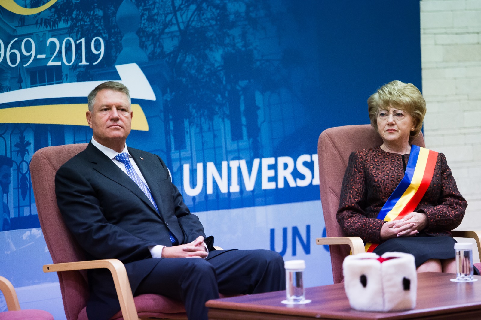 Președintele României, Klaus Iohannis a fost prezent astăzi, 4 octombrie, la manifestarea care a marcat 50 de ani de existență ai Universității „Lucian Blaga” din Sibiu și care a avut loc în aula Facultății de Medicină. Iohannis a ajuns la Facultatea de Medicină în jurul orei 9.30, fiind primit de Astrid Fodor, primarul Sibiului și de prof.univ. dr. Ioan Bondrea, rectorul ULBS. La eveniment au luat parte academicieni, profesori universitari, parlamentari, persoanlități ai lumii academice, studenți și invitați din țară și străinătate.