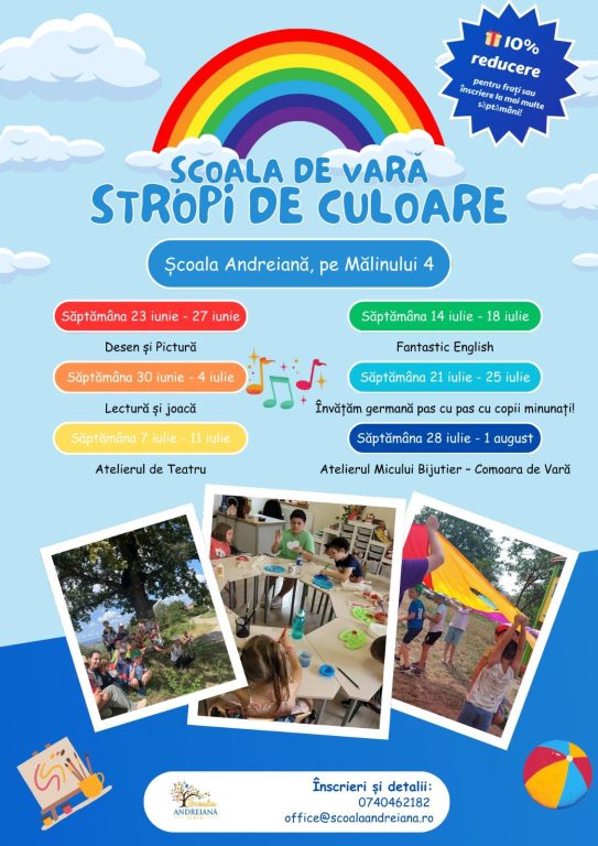 Vara aceasta, vacanța copiilor este colorată cu bucurie, creativitate și învățare prin joacă, în cadrul Școlii de Vară „STROPI DE CULOARE”, desfășurată în perioada 23 iunie – 1 august 2025.