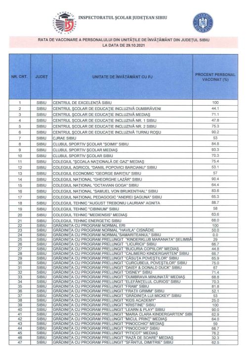 În ceea ce privește IȘJ Sibiu, aici 90% dintre angajați sunt vaccinați anti-COVID.