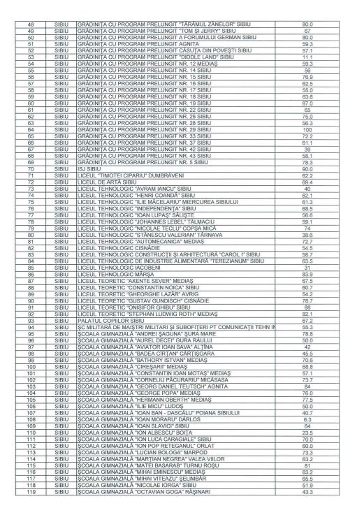 Conform listei oficiale a Inspectoratului Școlar Județean Sibiu, mari licee vor avea cursuri cu prezență fizică, printre care: Colegiul Național „Gheorghe Lazăr” Sibiu – rată de vaccinare de 90.4%, Colegiul Național „Octavian Goga” Sibiu – 64.4%, Colegiul Național „Samuel von Brukenthal” Sibiu – 83.6%, Colegiul Național Pedagogic „Andrei Șaguna” Sibiu – 65.3%, Colegiul Tehnic Energetic Sibiu – 68%, Liceul Teoretic „Onisifor Ghibu” Sibiu – 88%, Școala Gimnazială „Radu Selejan” Sibiu – 90.7%, Școala Gimnazială „Regele Ferdinand” Sibiu – 65% etc.