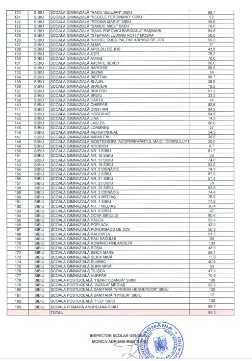 În ceea ce privește județul Sibiu, rata de vaccinare la nivelul unităților de învățământ este de 62.3%.