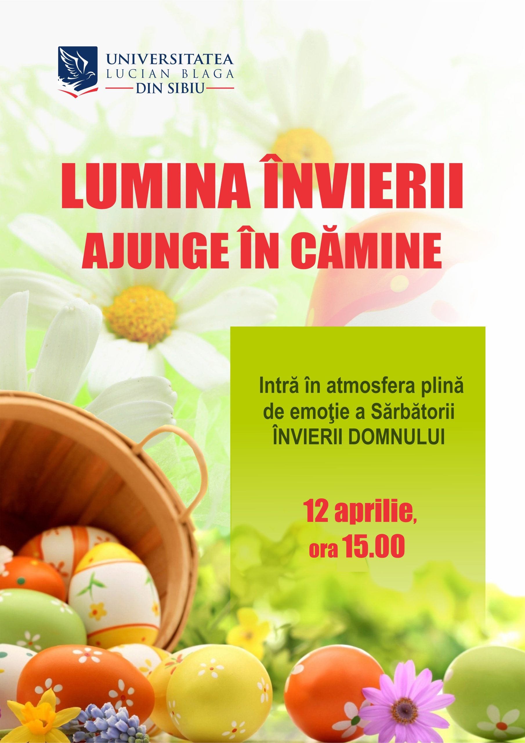 Universitatea ”Lucian Blaga” din Sibiu reia tradiția organizării de evenimente în căminele studențești. După doi ani în care studenții nu s-au putut bucura de obișnuitele întâlniri cu ocazia sărbătorilor, în 12 aprilie, începând cu ora 15,00, aceștia vor intra, din nou, în atmosfera tradițională de Paște.