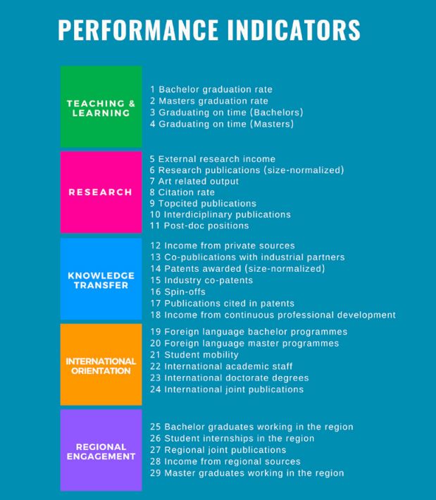 Datele analizate cuprind aproximativ 2.000 de universități din 96 de țări, cu ajutorul a cinci categorii de indicatori: predare și învățare, cercetare, transfer de cunoștințe, orientare internațională și implicare regională. Calficativele primite sunt de la A la E (cel mai slab).