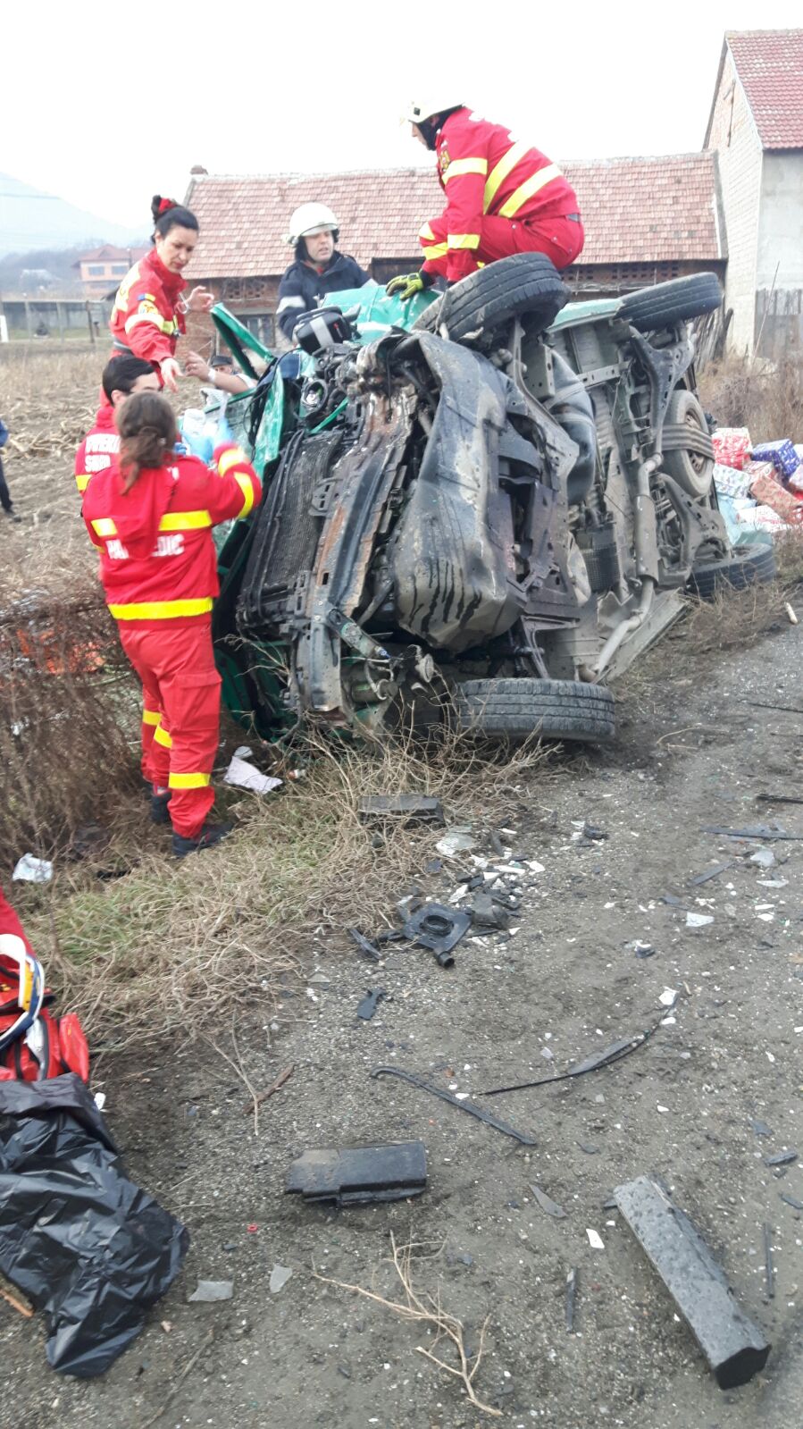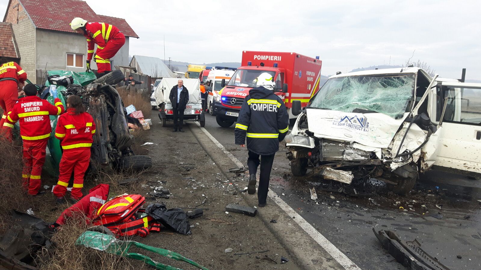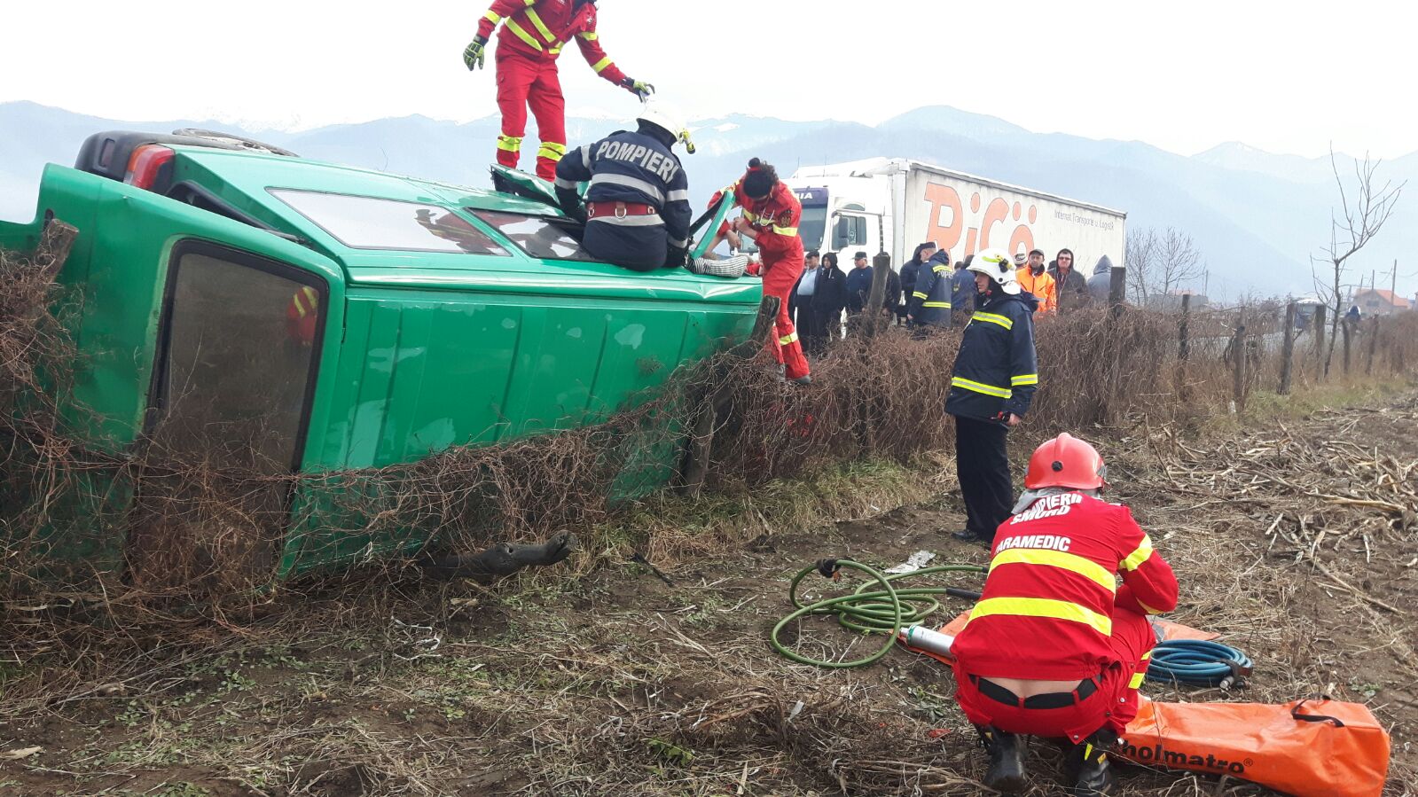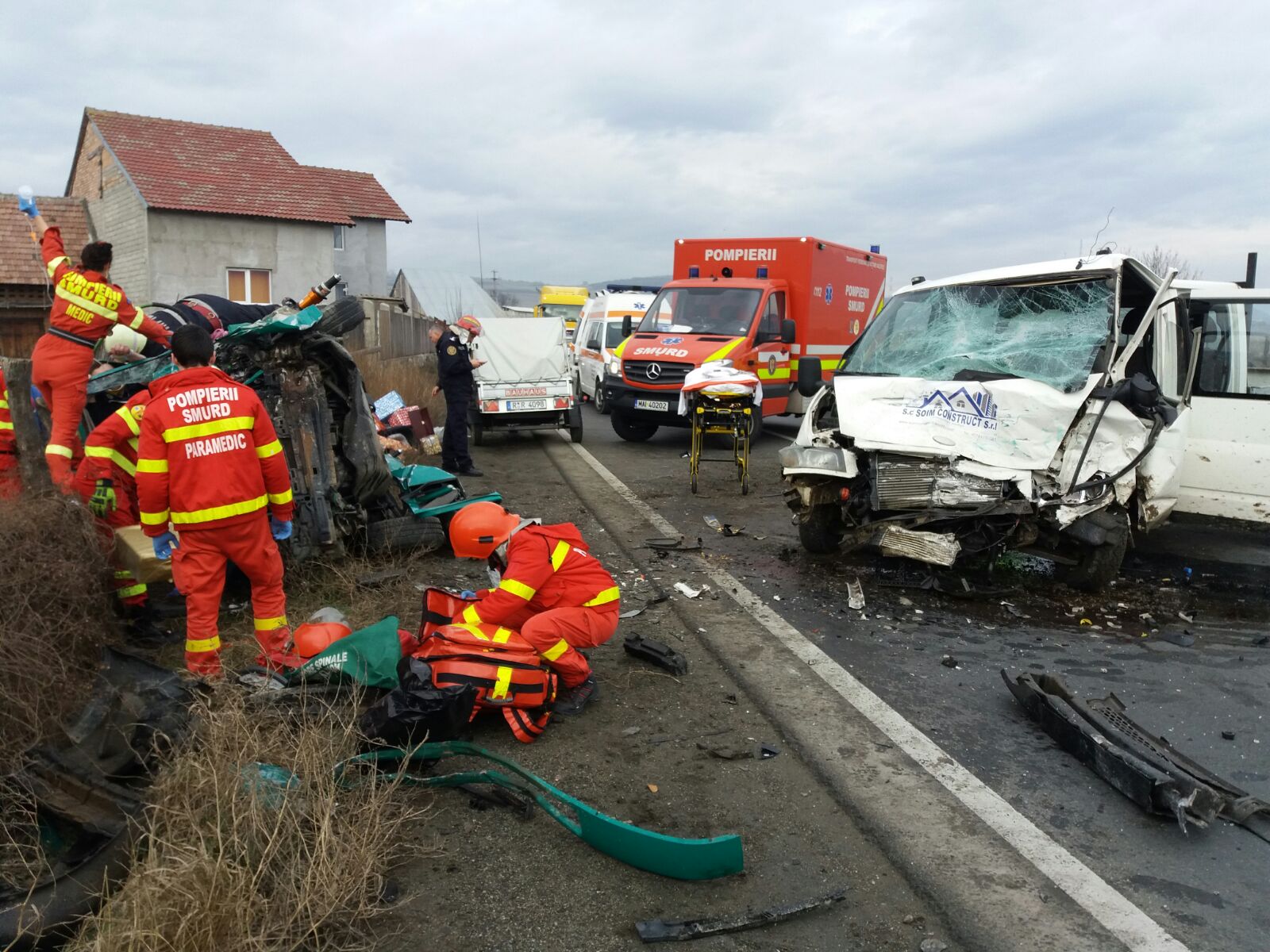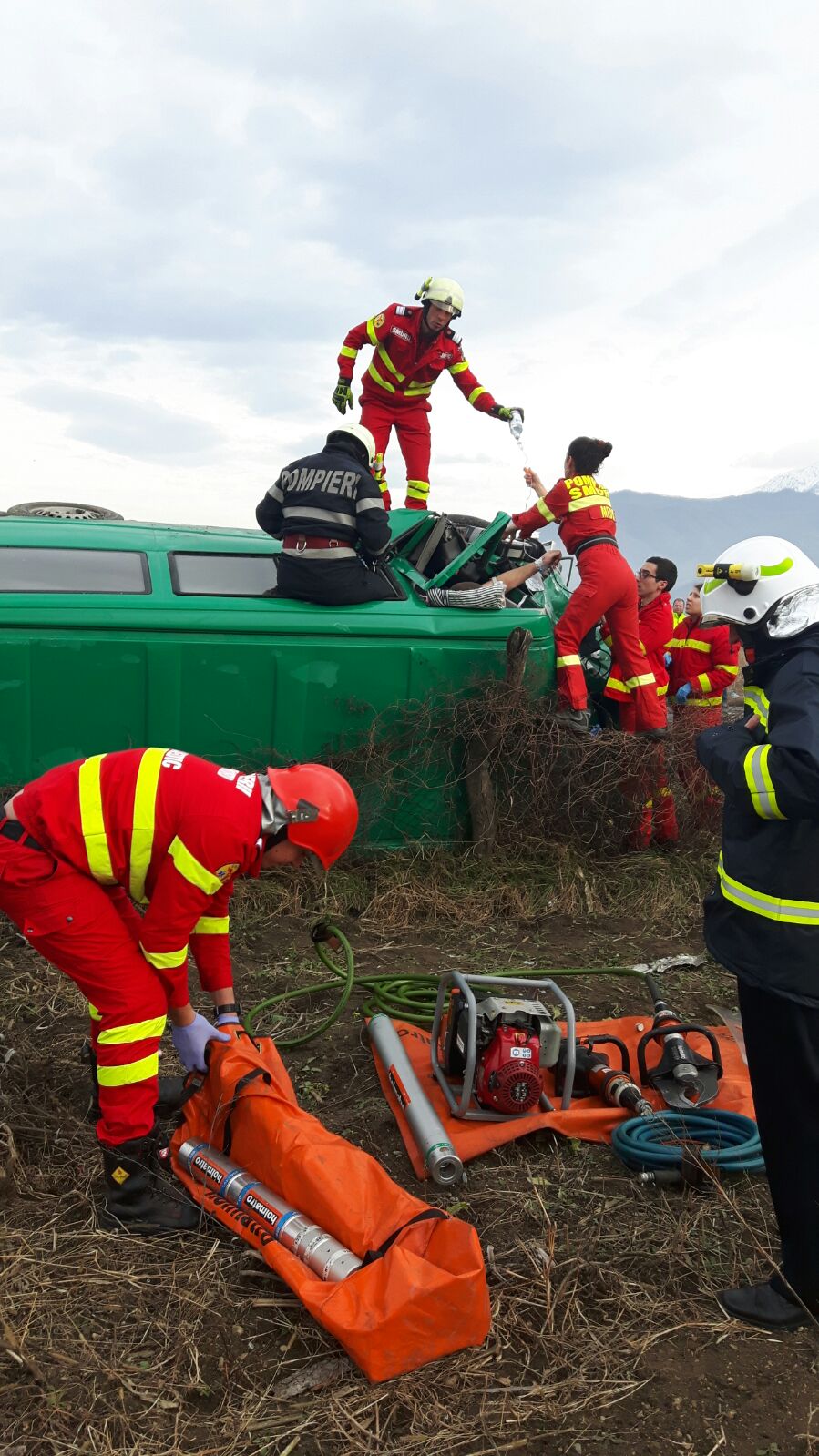 UPDATE – Potrivit ISU Sibiu, o persoană este încarcerată în microbuzul răsturnat, iar alte două persoane au fost preluate de Ambulanță și SMURD. Toate persoanele sunt conștiente. În acest moment se lucrează pentru descarcerarea victimei prinsă în microbuz. Șoferii celor două microbuze și un pasager au fost răniți în urma accidentului rutier.
