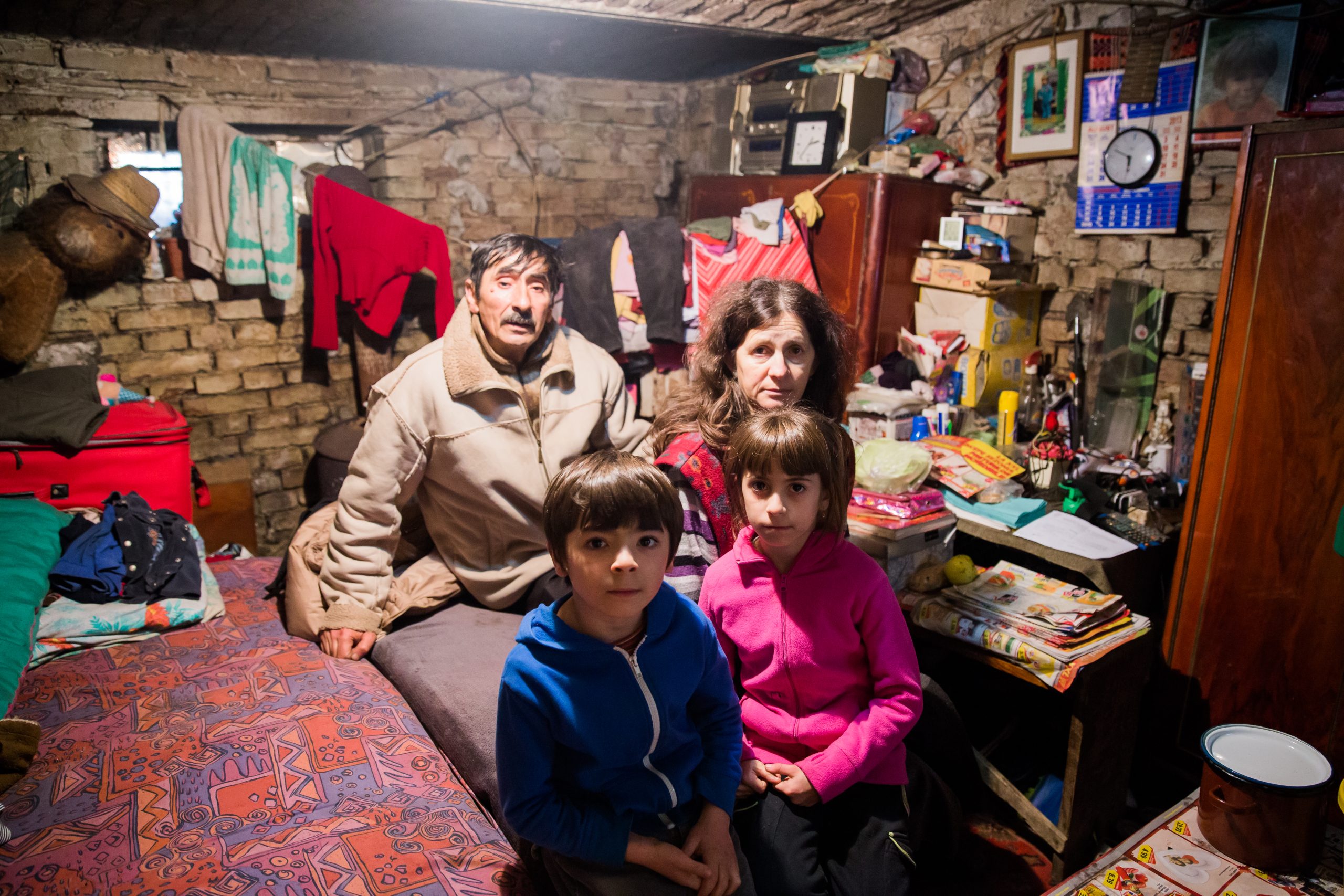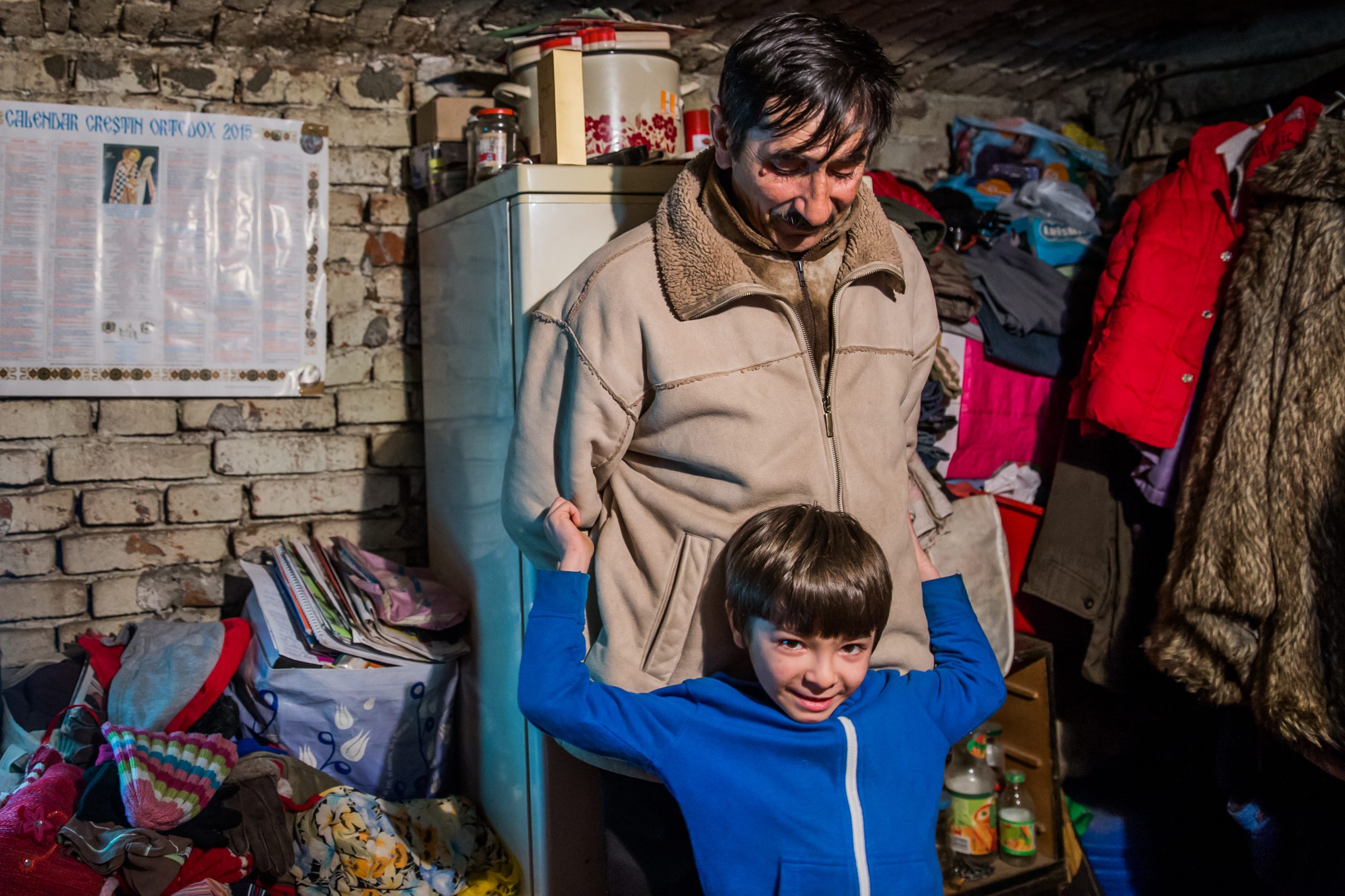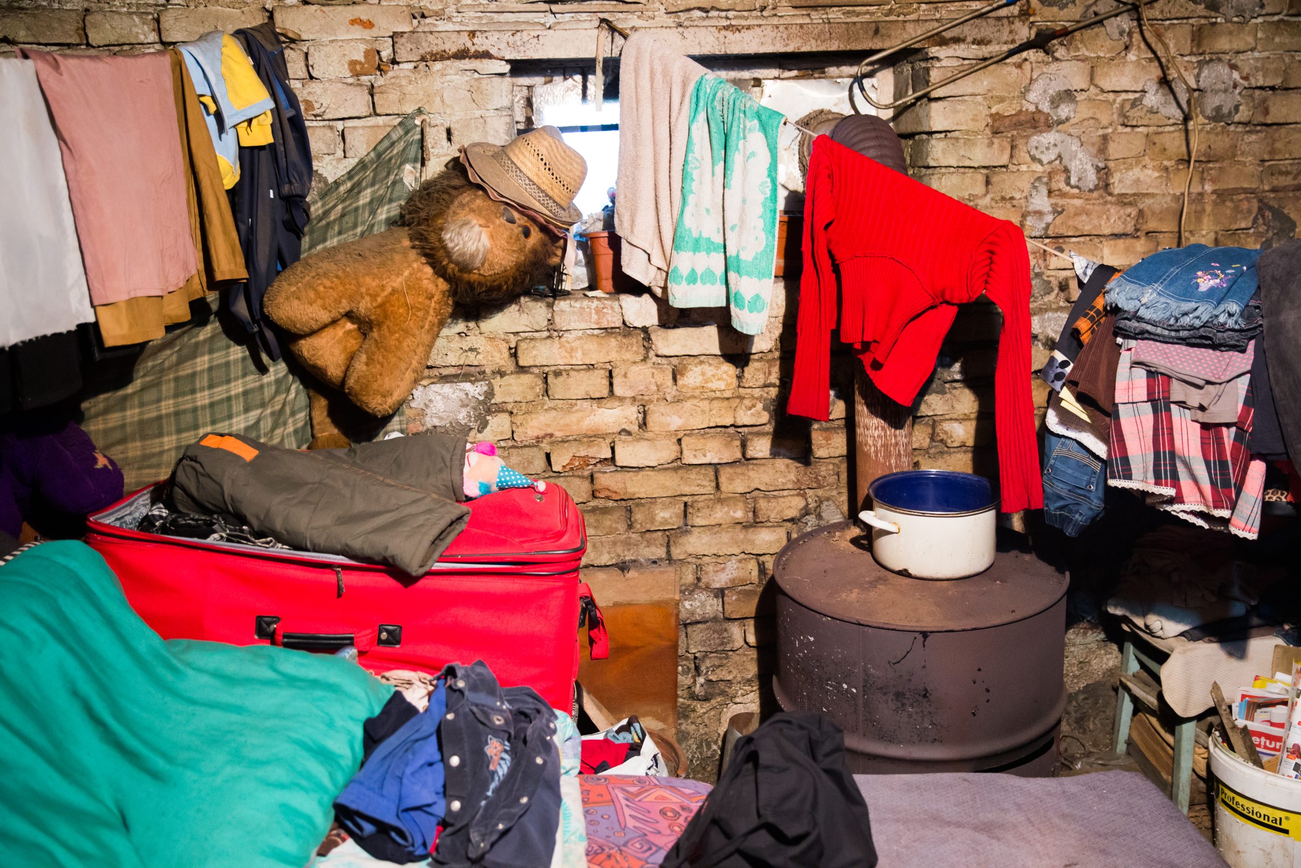 Gabriela Lucaci are 46 de ani. A fost căsătorită, însă nu a avut noroc, pentru că soțul ei s-a stins din viață, acum mulți ani, răpus de o boală cumplită. „Îmi amintesc și astăzi de el, era un om atât de bun, de blând”, spune femeia. Rămâne alături de familia lui, iar sprijin îi este fratele soțului, cu care, în cele din urmă, are doi copii. După ce casa în care au stat a fost vândută, s-au trezit fără un acoperiș deasupra capului. O mână li s-a întins din partea unei prietene de familie. „Ne-a oferit un spațiu în care să stăm, cu o chirie de 300 de lei pe lună. Este un beci cu multă umezeală și mucegai. Nu avem apă, nu avem o toaletă, ne încălzim cu o sobă improvizată, în care facem focul cu lemne, iar când nu avem lemne, facem cu ziare. Când bate vântul nu ne putem încălzi, pentru că tot fumul intră în casă. Aducem apă cu găleata de la vecini și ne spălăm într-un ligean”. Patul pe care dorm este improvizat dintr-o ușă de lemn, pusă pe butuci. Așa pot încăpea toți să doarmă. Venitul familiei Lucaci depășește cu puțin 570 de lei pe lună, din care 300 de lei este chiria, mai plătesc și curentul, iar restul banilor este de prisos să spun cât le ajung. De mâncat, mănâncă la Cantina Socială a Municipiului Sibiu, acolo unde au două mese pe zi. Cei doi părinți nu pot munci. Gabriela are un handicap din naștere. Diagnosticul ei este de luxație congenitală, o afecțiune dureroasă, care nu o mai lasă să stea în picioare sau să meargă mult. O bună perioadă de timp a avut o pensie de handicap de 234 de lei, însă din 2012 i s-a schimbat încadrarea gradului, iar pensia a scăzut la 33 de lei, bani prea puțini pentru a-și cumpăra medicamente. Tatăl copiilor, Ilie Lucaci suferă, la cei 55 de ani ai săi, de o boală gravă de plămâni, care îl ține mai mereu prin spital. De multe ori nu-și permite să stea alături de copii, pentru că mediul din beci îi agravează boala.