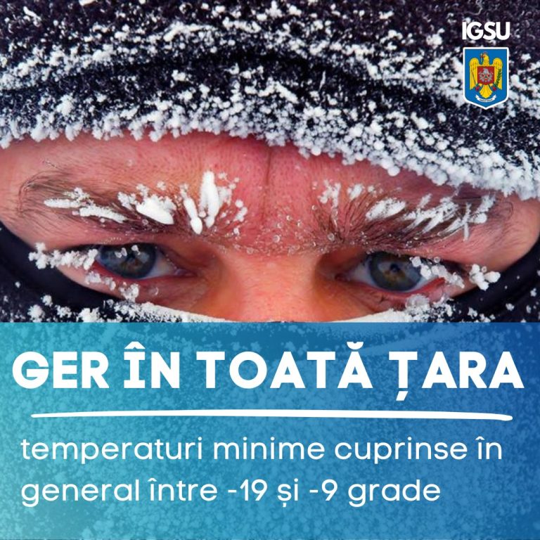 În noaptea de luni spre marți, gerul va cuprinde aproape întreaga țară, iar valul de aer rece va coborî temperaturile până la -19…-9 grade Celsius, cu cele mai scăzute valori în Transilvania și în zonele montane.