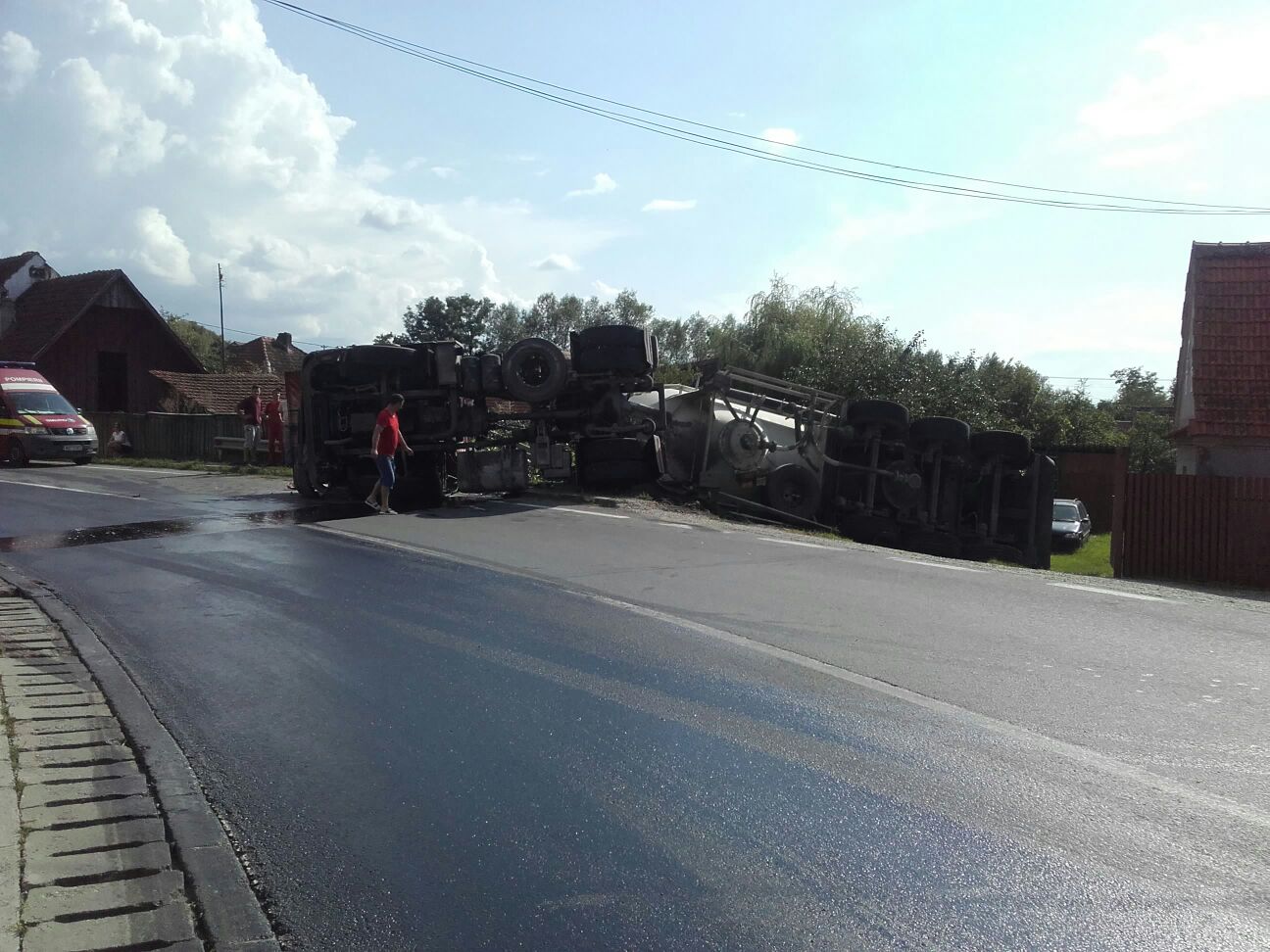”Un bărbat în vârstă de 58 ani, aflat în tranzit, în timp ce conducea o cisternă pe un sector de drum în curbă a pierdut controlul direcției de mers și s-a răsturnat pe partea carosabilă. În urma accidentului a rezultat, rănirea conducătorului auto și scurgerea pe carosabil a încărcăturii și a carburantului.” a declarat ionuț Natea, de la Biroul Rutier Sibiu