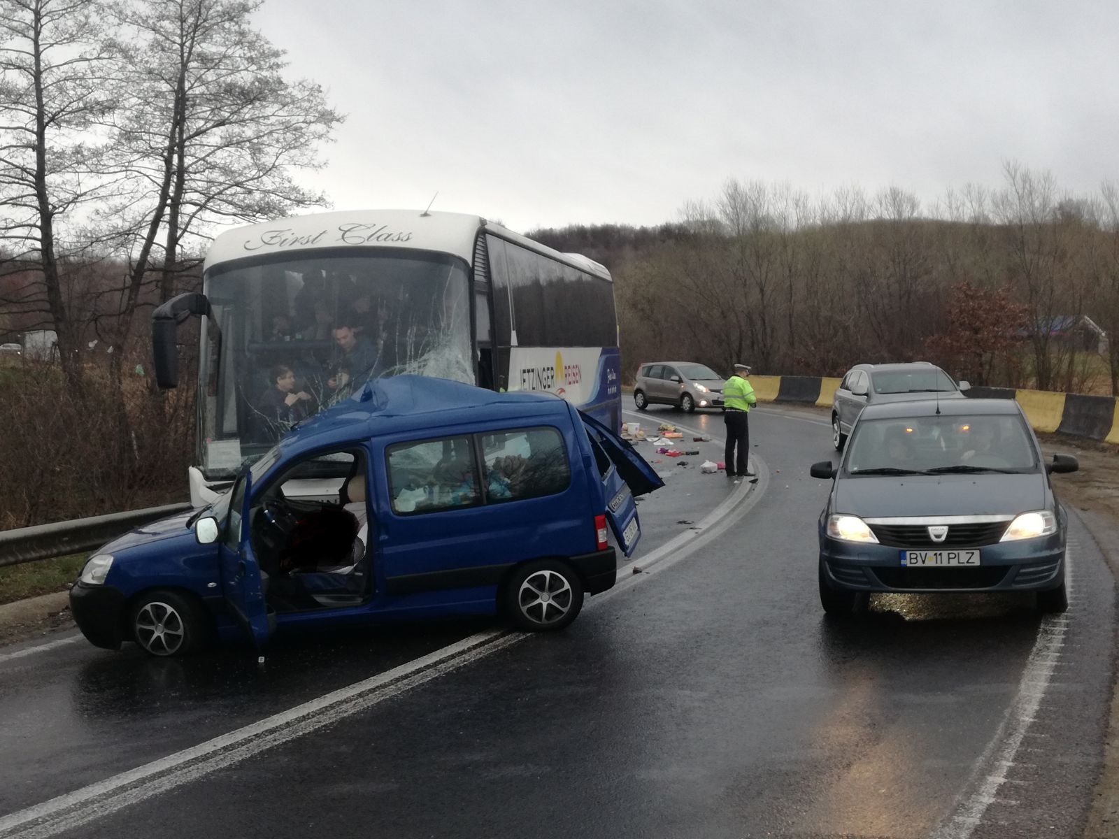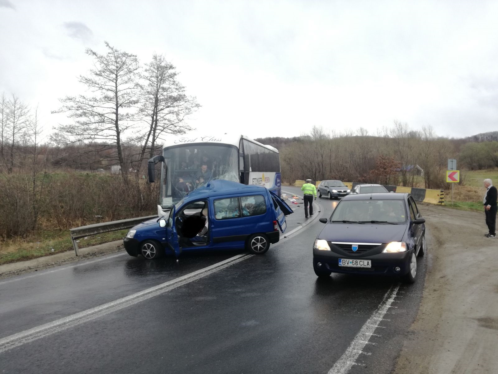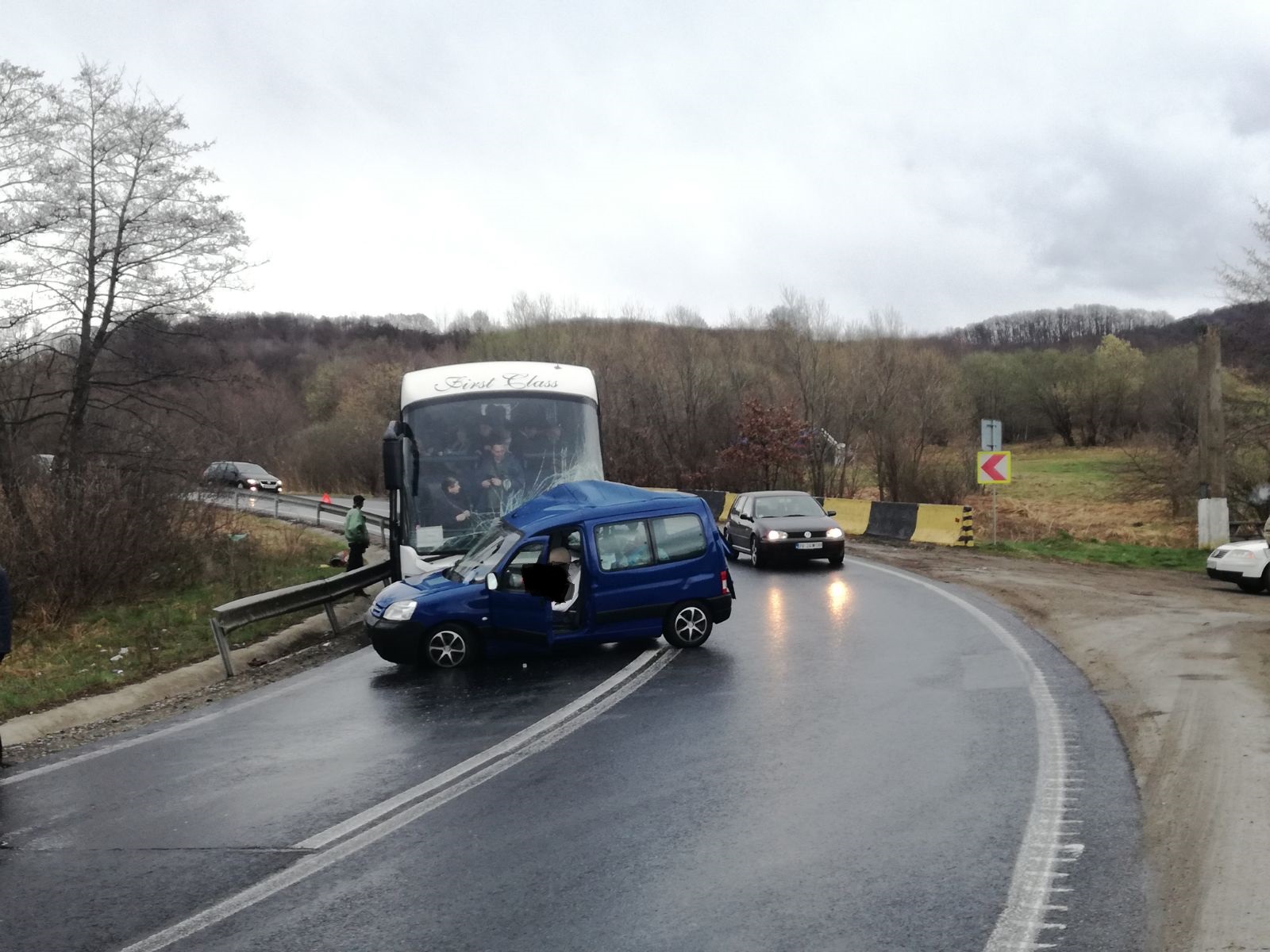 Accident grav, duminică dimineața, pe Drumul Național 1, la kilometrul 294, la Hula Bradului. Pe fondul vitezei neadaptate condițiilor de drum, șoferul unui autoturism care circula spre Brașov ,într-o curbă la stânga a pierdut controlul direcției, a intrat pe contrasens și s-a izbit de un autocar în care se aflau aproximativ 40 de persoane, condus regulamentar din sens opus. Pasagera de pe locul din drepta-față din autoturism a fost rănită grav, fiind încarcerată. De asemenea, o pasageră din autocar este rănită ușor. Traficul rutier se desfășoară alternativ pe Drumul Național 1.