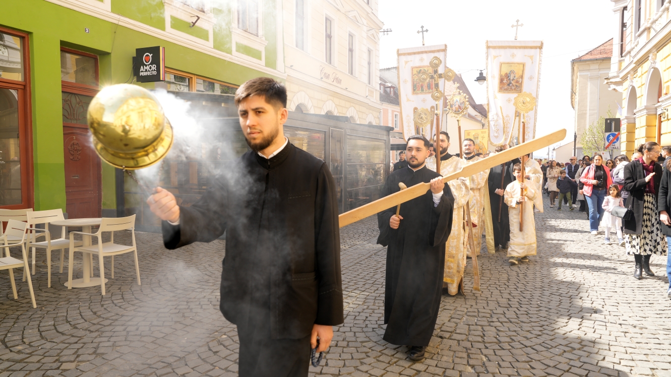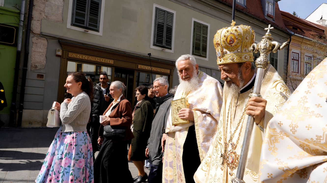 În fruntea lor, preoții au dus racla cu moaștele Andrei Șaguna și icoana Învierii, în timp ce cântările pascale răsunau printre clădirile istorice ale orașului.