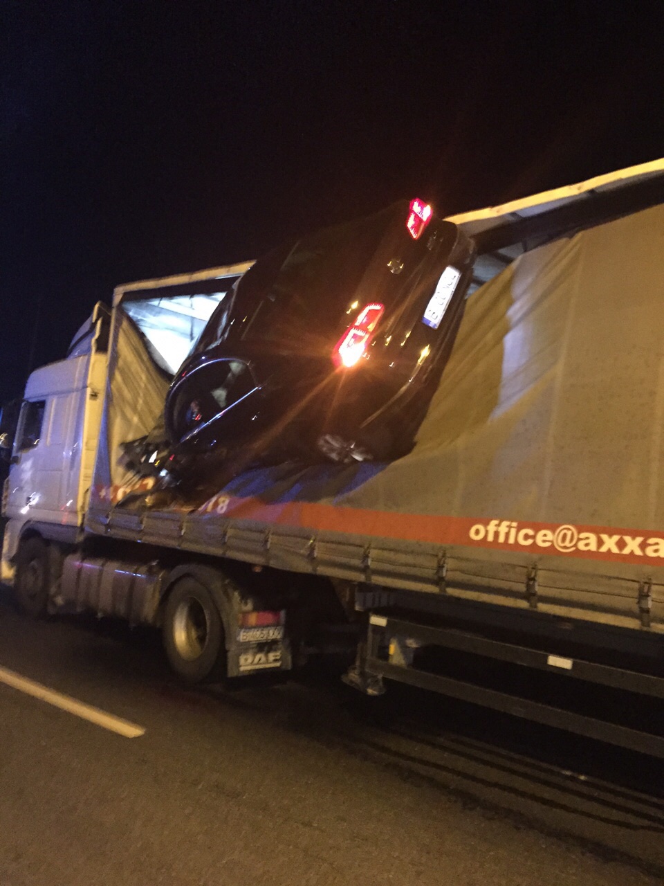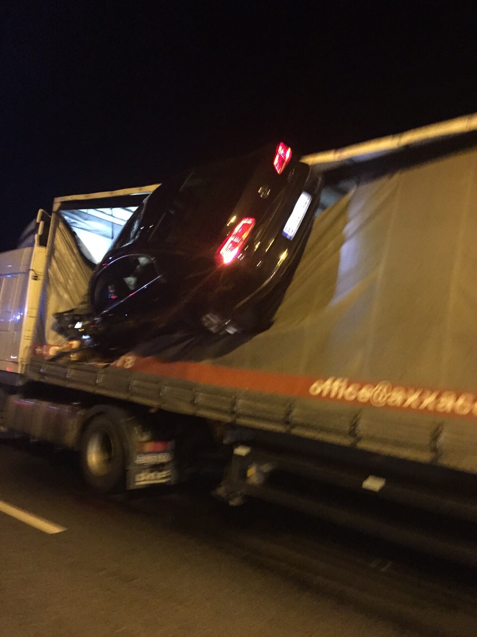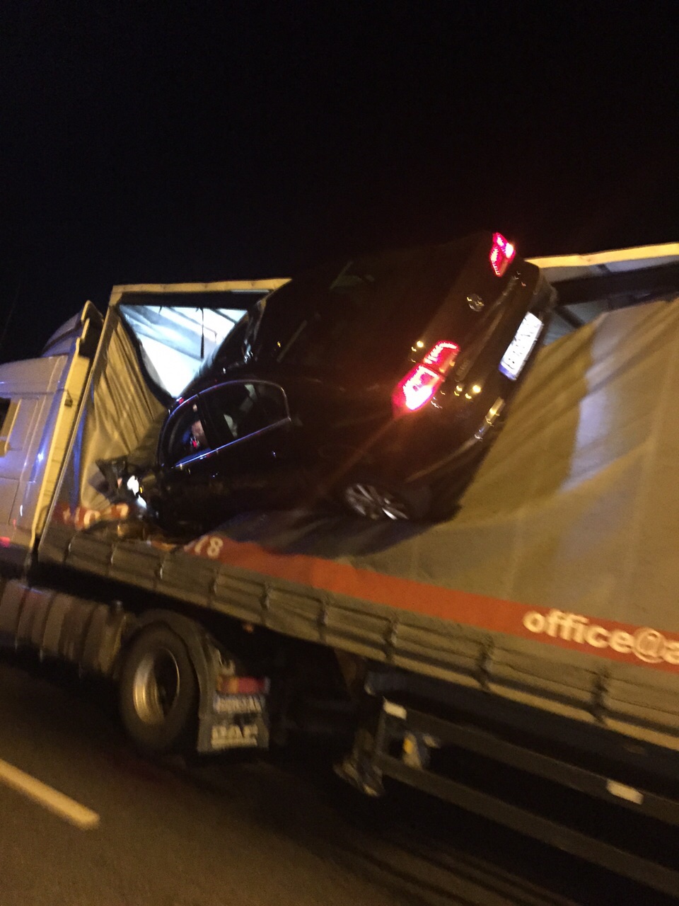 Accident demn de o cascadorie, pe DN1, în apropiere de Veștem. Un șofer de 37 de ani din Șelimbăr a reușit să sară cu mașina peste un giratoriu și s-a oprit direct în prelata unui TIR, mașina a rămas suspendată. Bărbatul era băut la volan și a circulat cu viteză amețitoare.