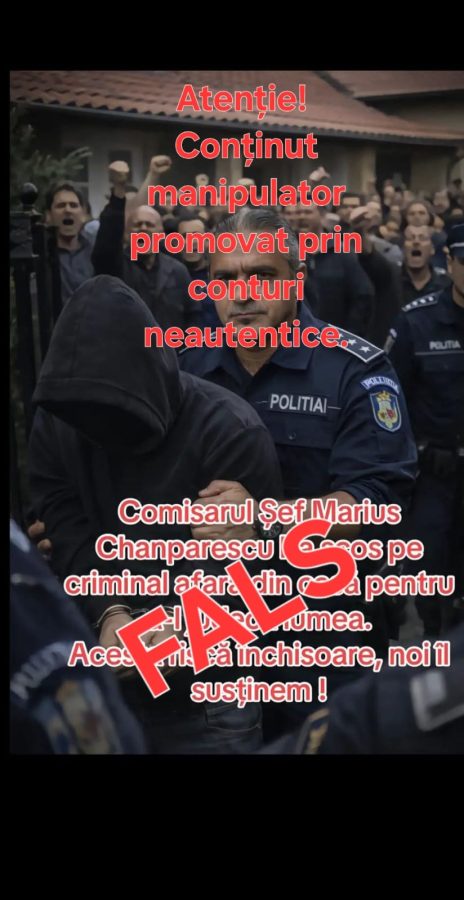 Concret, este vorba despre o imagine realizată cu ajutorul inteligenței artificiale prin intermediul căreia oamenii erau „informați” că un comisar șef ar fi scos din casă un „criminal” pentru a fi judecat de oameni.