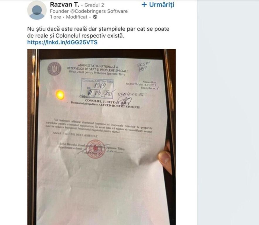 Este vorba despre o postare în care apare un document înaintat de Administrația Națională a Rezervelor de Stat și Probleme Speciale (ANRPS) către președinte CJ Timiș, Alfred Simonis.