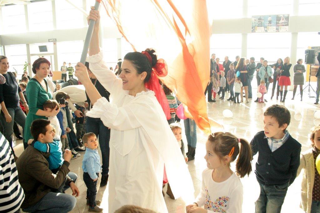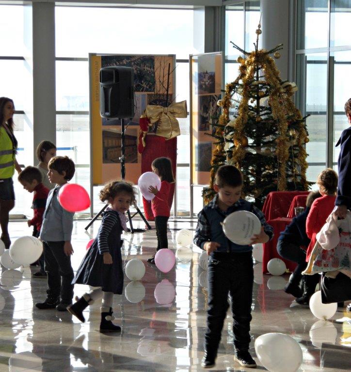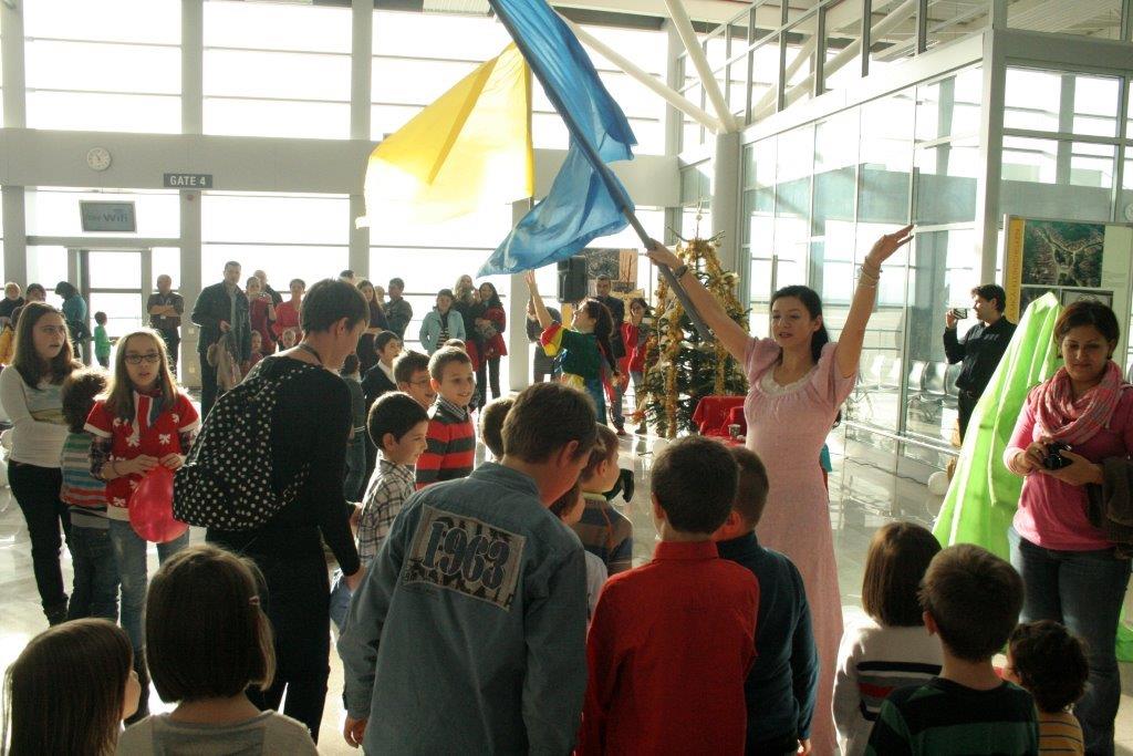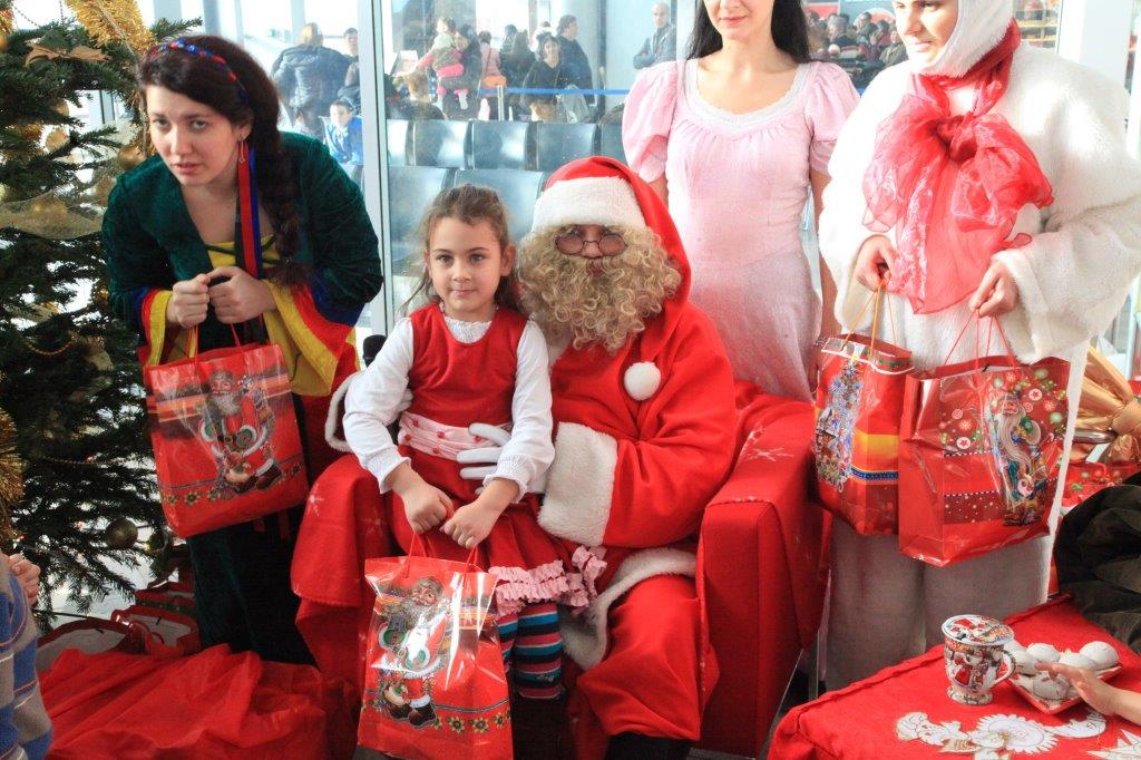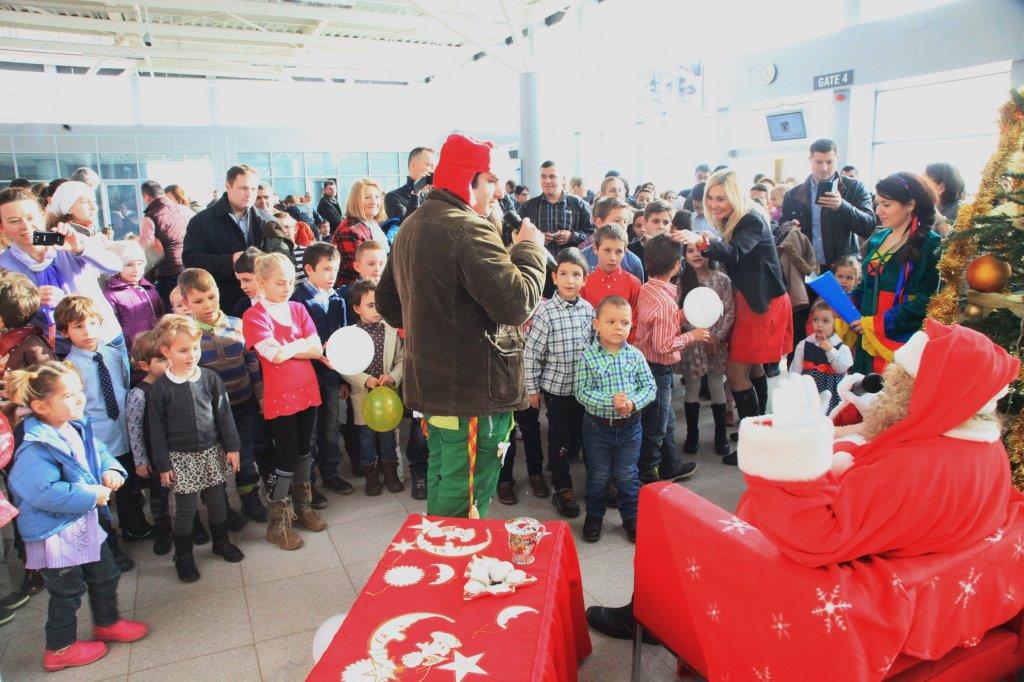 Ne-am pus pe treabă, am împodobit brăduțul și am adunat aproape 200 de copii de toate vârstele în jurul lui. Copii au cântat și s-au jucat, în compania tinerilor actori de la Teatrul Vostru, pâna când aeronava a aterizat. Apoi au ieșit pe platformă și au urmărit, curioși, cum Moșul coboară cu greu din avion, sub povara sacului cu daruri.