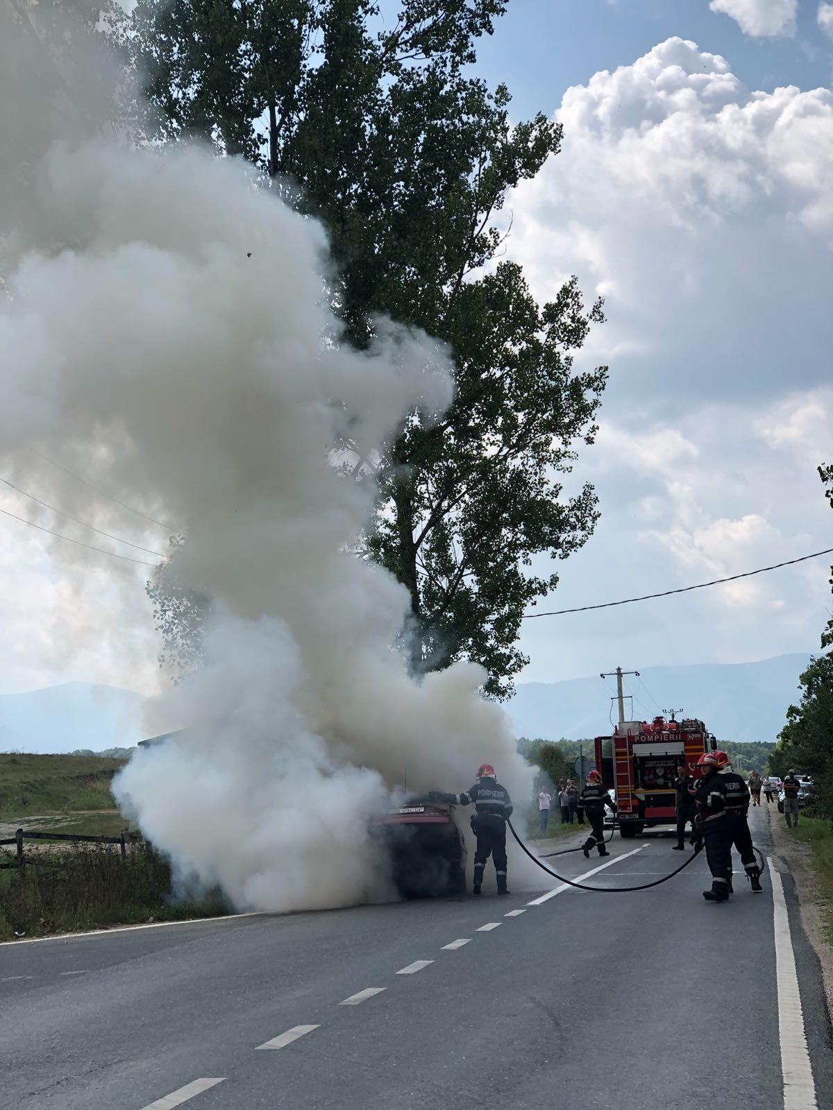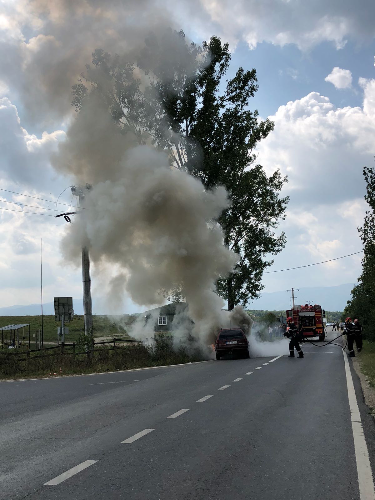 Flăcările au cuprins imediat autoturismul iar pompierii lucrează acum pentru a stinge focul. Cel mai probabil, incendiul a izbucnit din cauza unei defecțiuni tehnice.