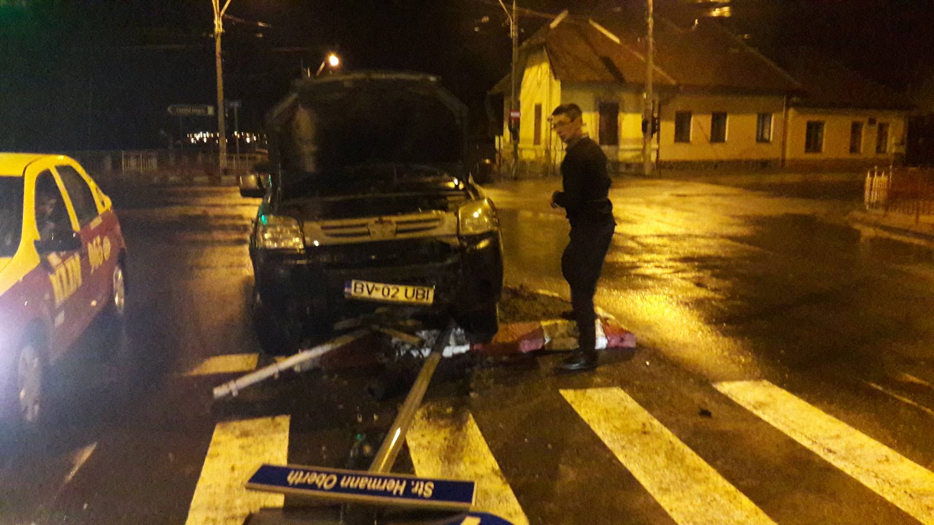 Șoferul unui autoturism înmatriculat în județul Brașov a făcut prăpăd în noaptea de vineri spre sâmbătă în Mediaș. În cea mai aglomerată intersecție a orașului, cea de la podul CFR, conducătorul auto cel mai probabil a ratat drumul, a rupt indicatoarele și s-a oprit direct pe insula din mijlocul intersecției. Din fericire, nicio persoană nu a fost rănită în urma acestui eveniment rutier. Cel mai probabil, șoferul va trebui să suporte din propriul buxunar contravaloarea bunurilor distruse.
