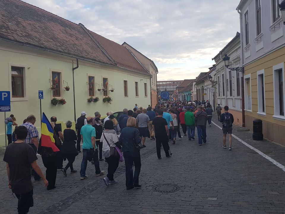Câteva sute de medieșeni au protestat, duminică seara, începând cu ora 18, nemulțumiți de politicile duse de alianța PSD-ALDE. Oamenii s-au strâns la ora 18 în Piața Corneliu Coposu, pe platoul din fața Primăriei Mediaș de unde au plecat spre sediul PSD din Piața Regele Ferdinand I. Acolo, protestatarii au scandat lozinci precum „PSD-ciuma roșie”, „Demisia” sau „Dragnea pentru noi/Este o ladă de gunoi”. Medieșenii au revenit apoi în piața din fața sediului administrației locale. Întregul protest s-a desfășurat fără niciun fel de incidente.