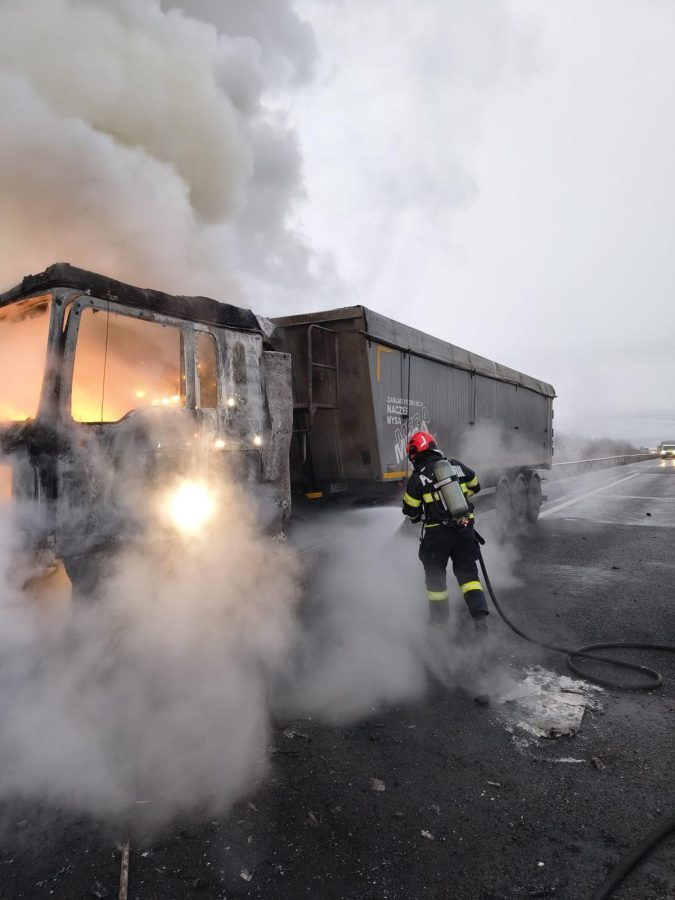 UPDATE: „Pompierii au lichidat incendiul. Acesta a afectat în totalitate capul tractor al ansamblului TIR și partea din față a remorcii.