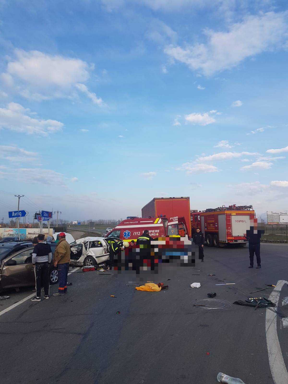 ”Accidentuls -a produs pe DN 1, la ieșire din Avrig spre Brașov. Șoferul unui turism a pătruns în drumul national fără să acorde prioritate și a intrat în coliziune cu un ansamblu TIR condus regulamentar spre Brașov, după care a fost proiectat într-un alt turism condus regulamentar spre Sibiu.” a declarat Elena Welter, purtător de cuvânt al IPJ Sibiu