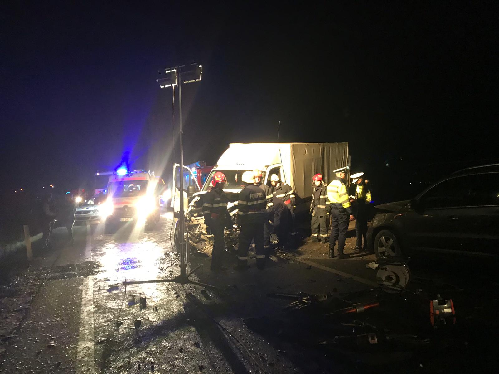 UPDATE 2 – Din primele cercetări, se pare ca accidentul s-ar fi produs pe fondul vitezei neadaptate. :Pe Drumul Național 14, la kilometrul 66+800 de metri, pe un tronson în curbă la dreapta, un șofer în vârstă de 45 de ani din județul Mureș, care conducea un autoturism pe sensul Mediaș-Sighișoara a pierdut controlul direcției de deplasare, a pătruns pe contrasens și a intrat în coliziune cu o autoutilitară condusă regulamentar din sens opus de către un bărbat în vârsta de 61 de ani, din județul Alba. Din impact a fost acrosat și autoturismul aflat în spatele mașinii care a pătruns pe contrasens. În urma coliziunii, au rezultat decesul șoferului din Mureș și al unei tinere în vârstă de aproximativ 20 de ani, rănirea grava a unei adolescente în vârstă de 16 ani, a unei femei de 45 de ani, toate 3 din Mureș, pasagere în același autoturism, și rănirea șoferului autoutilitarei. Din al treilea autovehicul nu au fost persoane rănite”, a spus Elena Welter, purtătorul de cuvânt al IPJ Sibiu.