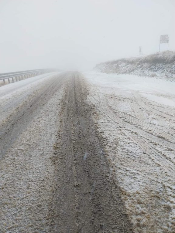 Temperatura scăzută a transformat precipitațiile în lapoviță și ninsoare care s-a depus pe partea carosabilă.