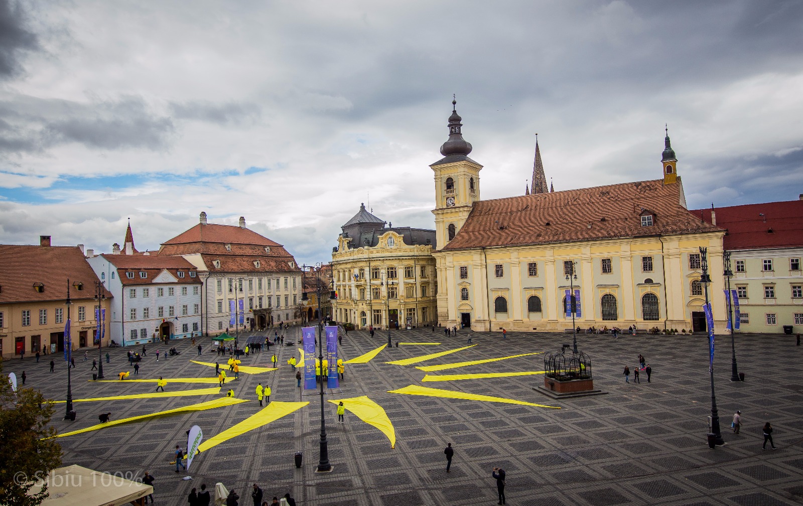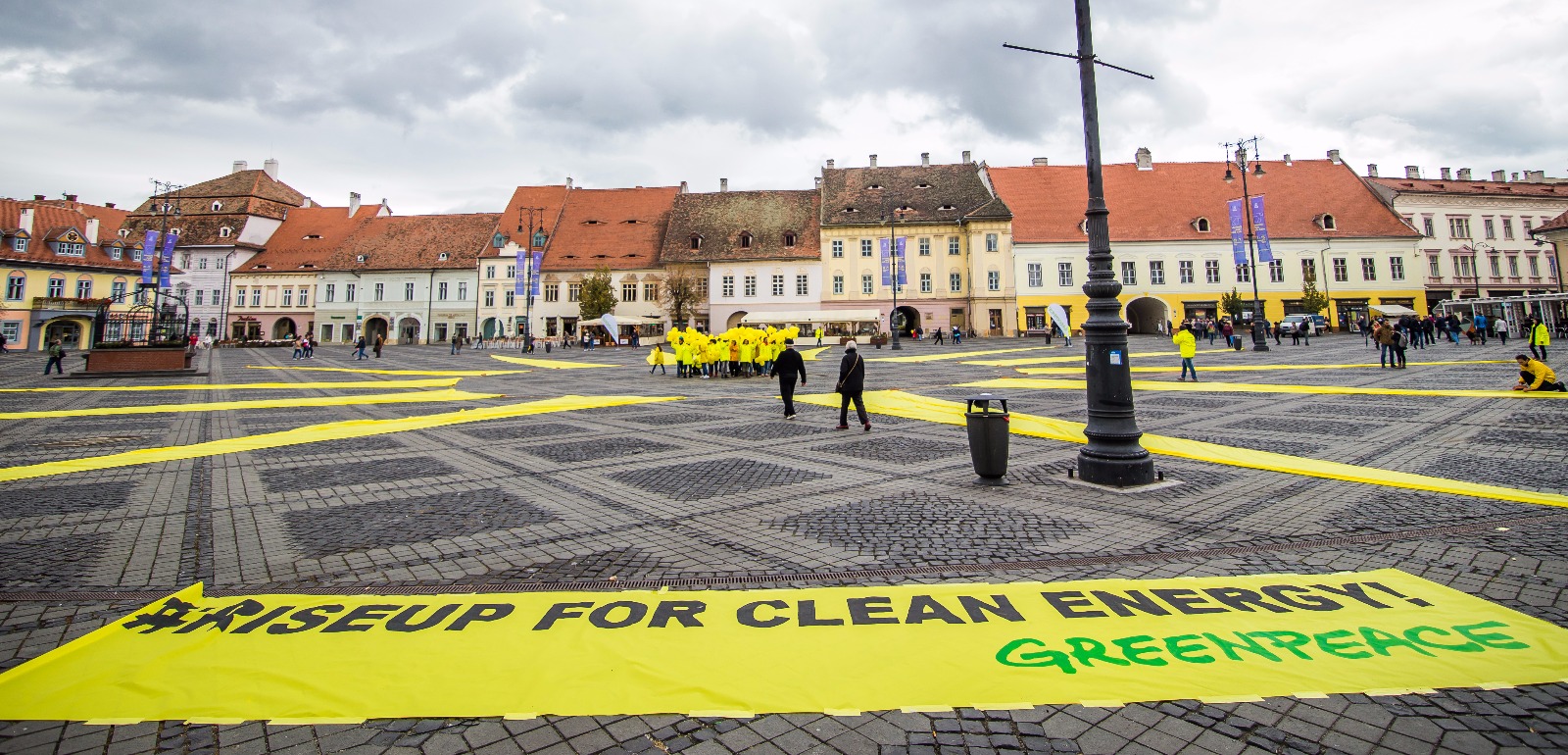 Greenpeace a adus soarele la Sibiu într-o zi mohorâtă de luni. 60 de persoane au reușit să creeze un peisaj galben în inima orașului, cu ajutorul unor petale de pânză, evenimentul încununând o serie de astfel de proiecte care au pornit de la un soare pictat în Paris, la Summitul Națiunilor Unite despre climă, din anul 2015.