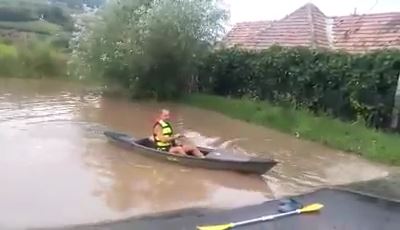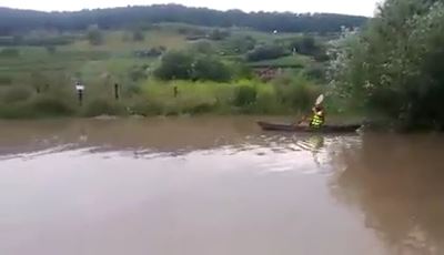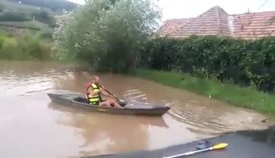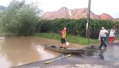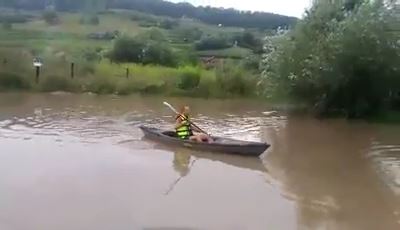 Ca la fiecare ploaie torențială, străzile din municipiul Mediaș s-au transformat în adevărate lacuri. Ploaia torențială de marți după amiaza a creat din nou probleme în zona centrală a orașului, dar și în cartierele Automecanica și Vitrometan. Un medieșean a văzut și partea bună a lucrurilor: și-a scos caiacul și a „dat o tură”. S-a întâmplat în cartierul Moșnei, la ieșirea din Mediaș, în zona unei stații de autobuz. Adrian Adam și-a luat caiacul și s-a plimbat puțin pe „lacul” care s-a format după ploaie.