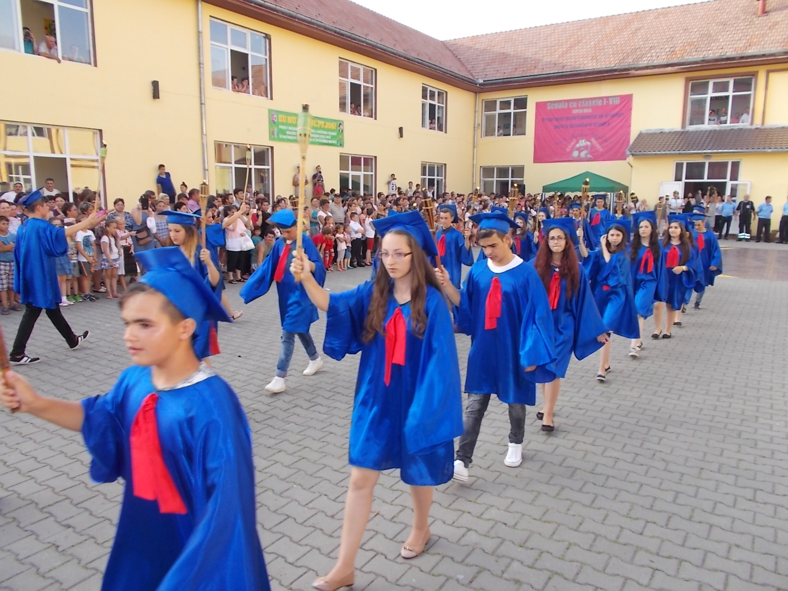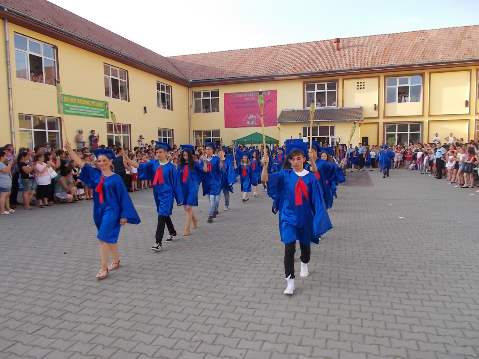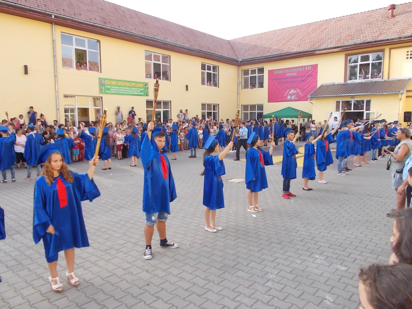 Cu certitudine elevii claselor a VIII-a de la Școala Gimnazială din Copşa Mică îşi vor aminti mereu cu mare bucurie de festivitatea de absolvire a ciclului gimnazial, de joi, 23 iunie 2015. Toți elevii Școlii Gimnaziale din oraș s-au întâlnit la ora 19 pentru a participa la un scurt moment artistic, dar și pentru retragerea cu torţe a colegilor din clasa a VIII-a. Ritualul retragerii cu torțe simbolizează trecerea elevilor din ciclul gimnazial în cel liceal, este văzut în special la retragerea elevilor de la liceele militare, iar ideea a apărut la Copșa Mică în urmă cu 10 ani, când a fost organizat pentru prima dată. După retragere cu torțe, toți cei prezenți în curtea școlii din Copșa Mică au luat parte la un flashmob, după care au încins și o horă. „Fiind o ediție aniversară, ne-am dat toată silința ca anul acesta să iasă ceva spectaculos, așa cum de altfel a și ieșit. Atmosfera a fost incendiară și nu din cauza caniculei, ci datorită nouă, elevilor și dascălilor de la școala din Copșa Mică. Împreună cu elevii am pregătit pentru comunitate și pentru prietenii acestei școli un spectacol de neuitat. 16 numere artistice diferite, bogate, muzică, dans, beatbox, flashmob-uri, hore, totul pentru noi, cei de la școala din Copșa Mică. Ideea cu torțele am primit-o de la domnul primar, care a considerat că în semn de respect pentru absolvenții noștri, pentru acest oraș în care trăim cu toții, ar fi deosebit și potrivit să ne retragem într-un mod solemn în fiecare an, de 10 ani încoace”, a spus directorul adjunct al Școlii Gimnaziale Copșa Mică, Oana Sturz.