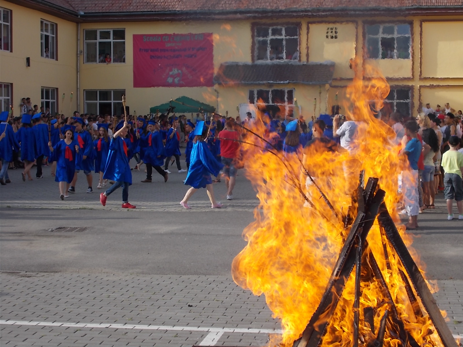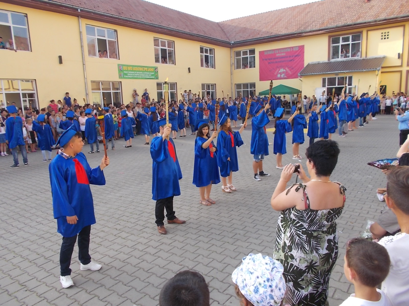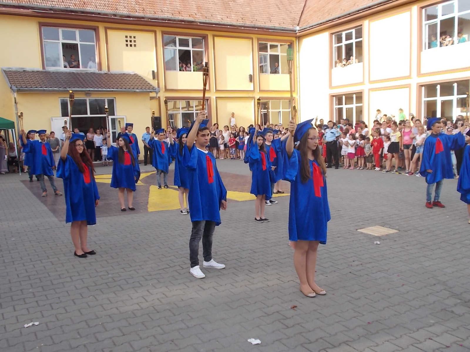 Cu certitudine elevii claselor a VIII-a de la Școala Gimnazială din Copşa Mică îşi vor aminti mereu cu mare bucurie de festivitatea de absolvire a ciclului gimnazial, de joi, 23 iunie 2015. Toți elevii Școlii Gimnaziale din oraș s-au întâlnit la ora 19 pentru a participa la un scurt moment artistic, dar și pentru retragerea cu torţe a colegilor din clasa a VIII-a. Ritualul retragerii cu torțe simbolizează trecerea elevilor din ciclul gimnazial în cel liceal, este văzut în special la retragerea elevilor de la liceele militare, iar ideea a apărut la Copșa Mică în urmă cu 10 ani, când a fost organizat pentru prima dată. După retragere cu torțe, toți cei prezenți în curtea școlii din Copșa Mică au luat parte la un flashmob, după care au încins și o horă. „Fiind o ediție aniversară, ne-am dat toată silința ca anul acesta să iasă ceva spectaculos, așa cum de altfel a și ieșit. Atmosfera a fost incendiară și nu din cauza caniculei, ci datorită nouă, elevilor și dascălilor de la școala din Copșa Mică. Împreună cu elevii am pregătit pentru comunitate și pentru prietenii acestei școli un spectacol de neuitat. 16 numere artistice diferite, bogate, muzică, dans, beatbox, flashmob-uri, hore, totul pentru noi, cei de la școala din Copșa Mică. Ideea cu torțele am primit-o de la domnul primar, care a considerat că în semn de respect pentru absolvenții noștri, pentru acest oraș în care trăim cu toții, ar fi deosebit și potrivit să ne retragem într-un mod solemn în fiecare an, de 10 ani încoace”, a spus directorul adjunct al Școlii Gimnaziale Copșa Mică, Oana Sturz.