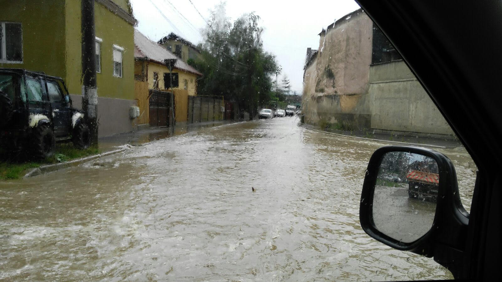 Ploaia torentiala a facut deja ravagii in oras. In doar cateva minute, canalizarea din Gusterita nu a mai facut fata, iar strazile s-au transformat in adevarate rauri. Oamenii spun ca a plouat mai putin de cinci minute, dar in averse puternice.