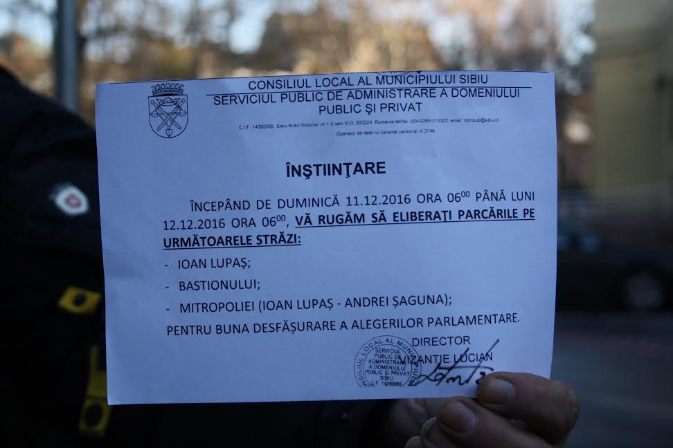 „Începând de duminică, 11.12.2016, ora 06.00, și până luni 12.12.2016, ora 06.00, vă rugăm să eliberați parcările pe următoarele străzi: Ioan Lupaș, Bastionului, Mitropoliei (Ioan Lupaș – Andrei Șaguna) pentru pentru buna desfășurare a alegerilor parlamentare”, scrie pe câte un panou postat în aceste parcări.