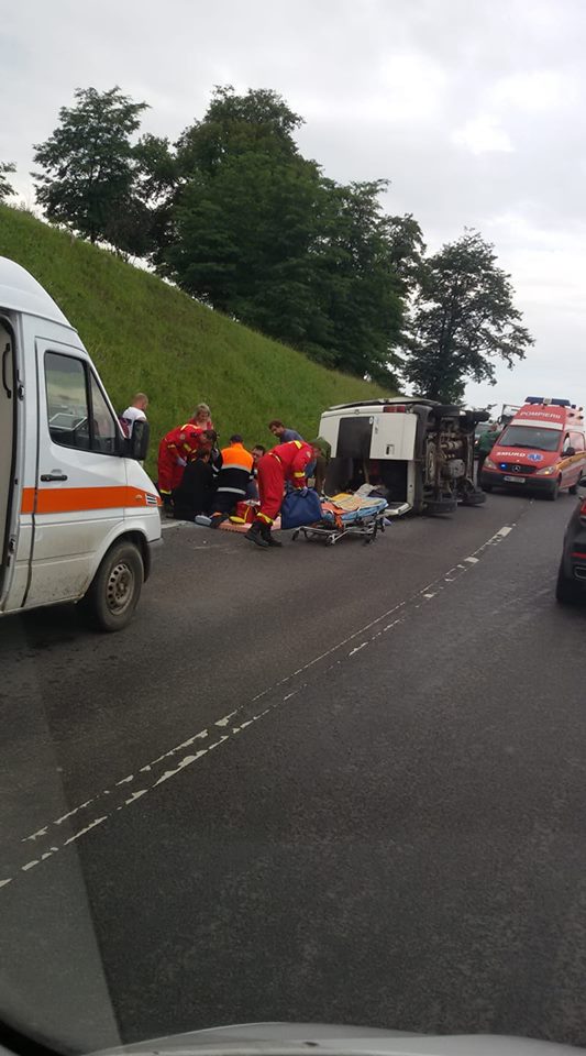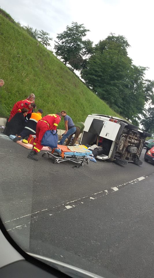 FOTO și VIDEO – Microbuz răsturnat pe DN 14