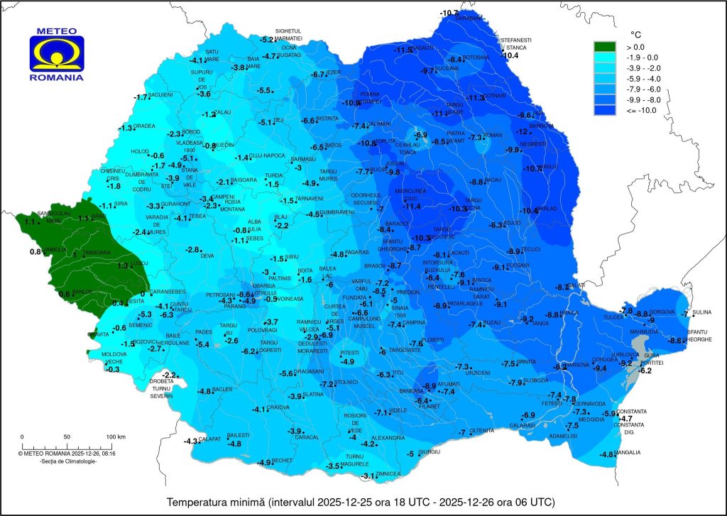 Potrivit Meteoplus, cea mai scăzută temperatură a nopții a fost minus 12 grade la Bârnova.