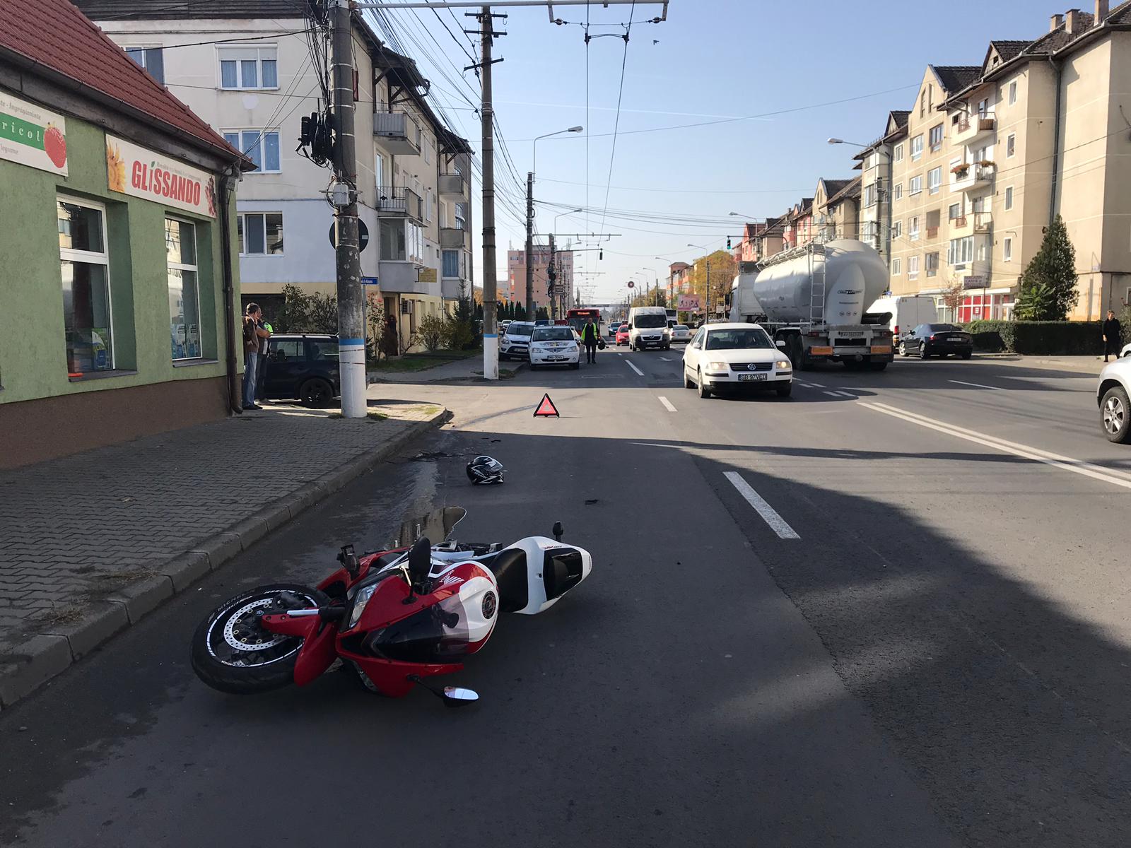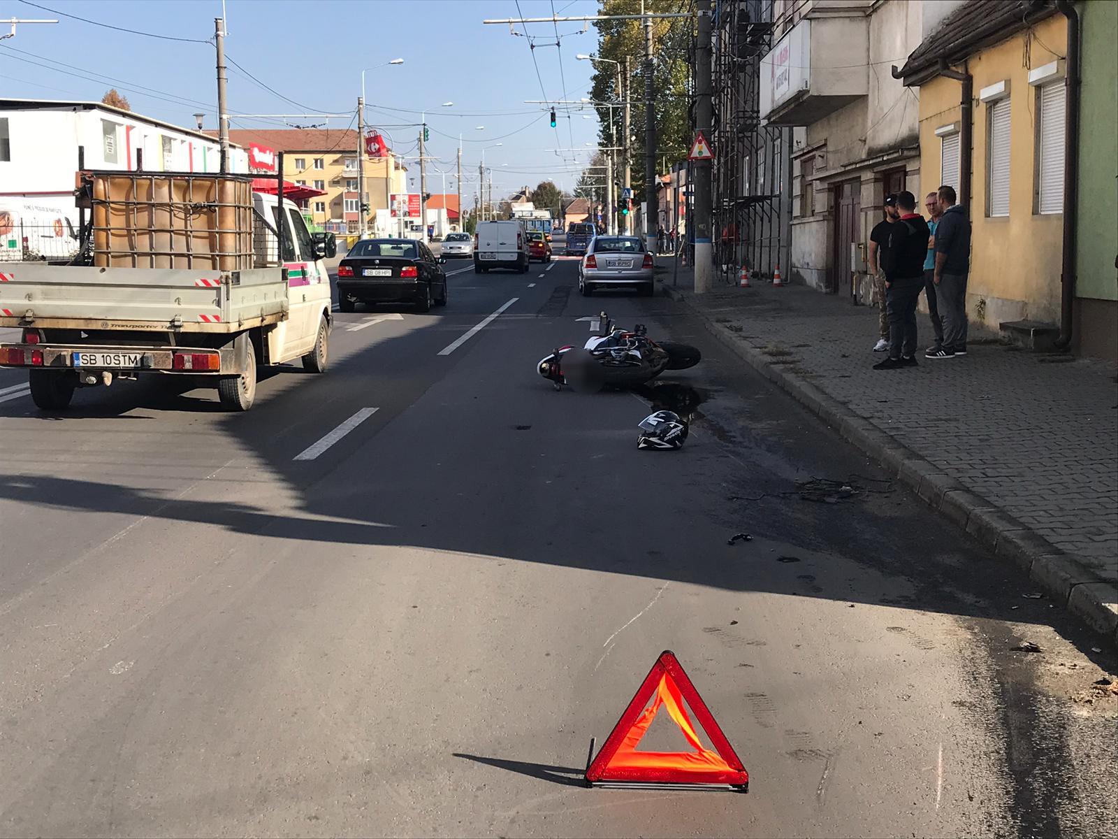 Un motociclist în vârstă de 29 de ani a fost lovit, miercuri, în jurul prânzului, de un șofer care nu a acordat prioritate la efectuarea virajului la stânga.