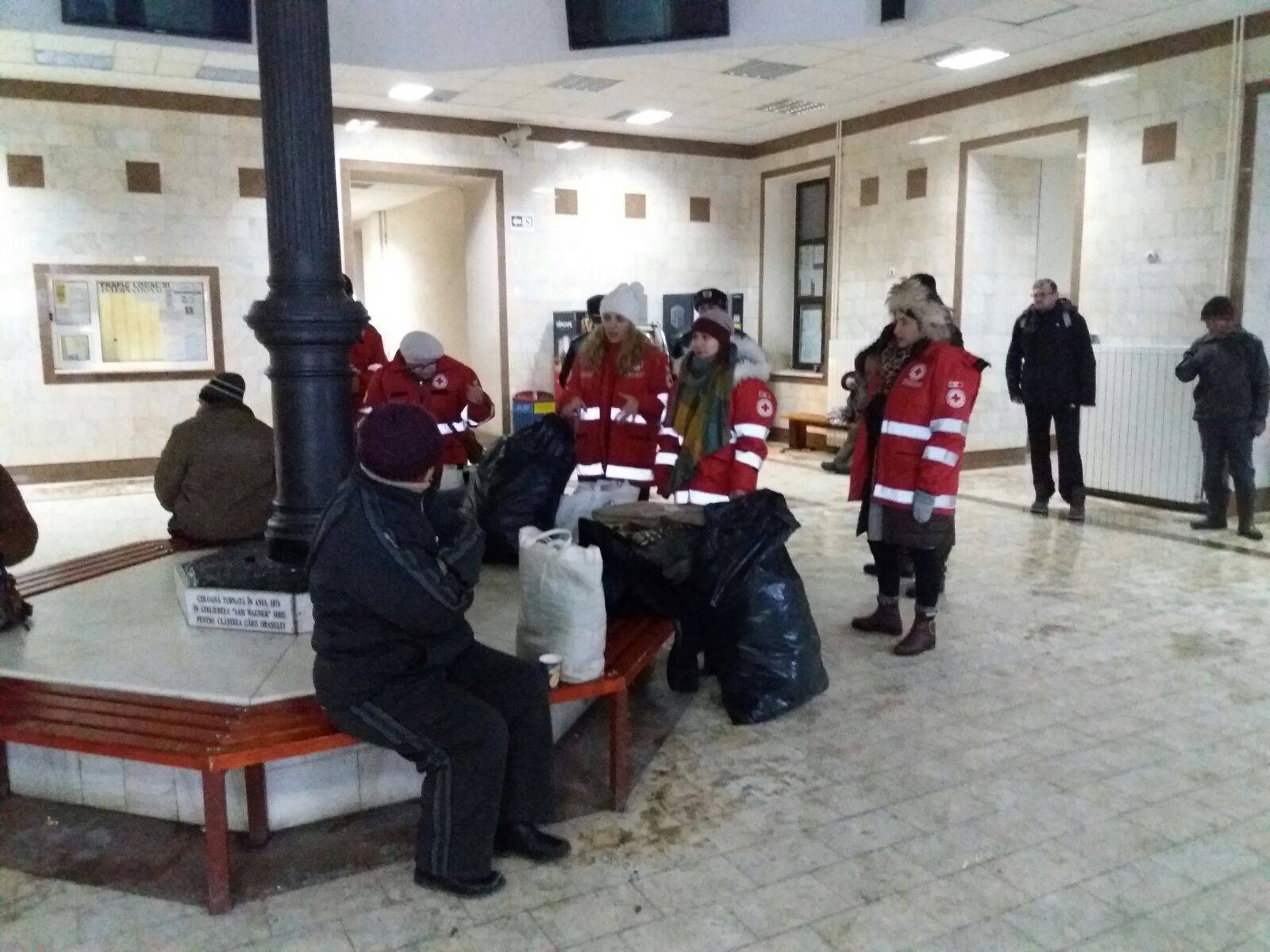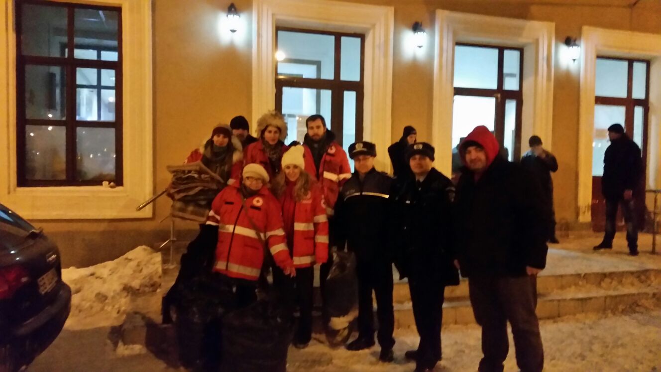 „Avertizările meteorologilor de cod portocaliu de ger prognozate pentru această perioadă i-au determinat pe reprezentanții Filialei Crucea Roșie Sibiu și polițiștii de la transporturi Sibiu să desfășoare în Stația C.F.R. Sibiu o acțiune în beneficiul persoanelor fără adăpost. În cadrul acțiunii au fost identificate 10 persoane fără adăpost, toate aflate în evidența polițiștilor de la Postul de Poliție Transporturi Feroviare Sibiu, cărora le-au fost distribuite haine groase, geci, paltoane, pulovere, căciuli, fulare, încălțăminte de sezon, mâncare, dulciuri şi ceai cald.