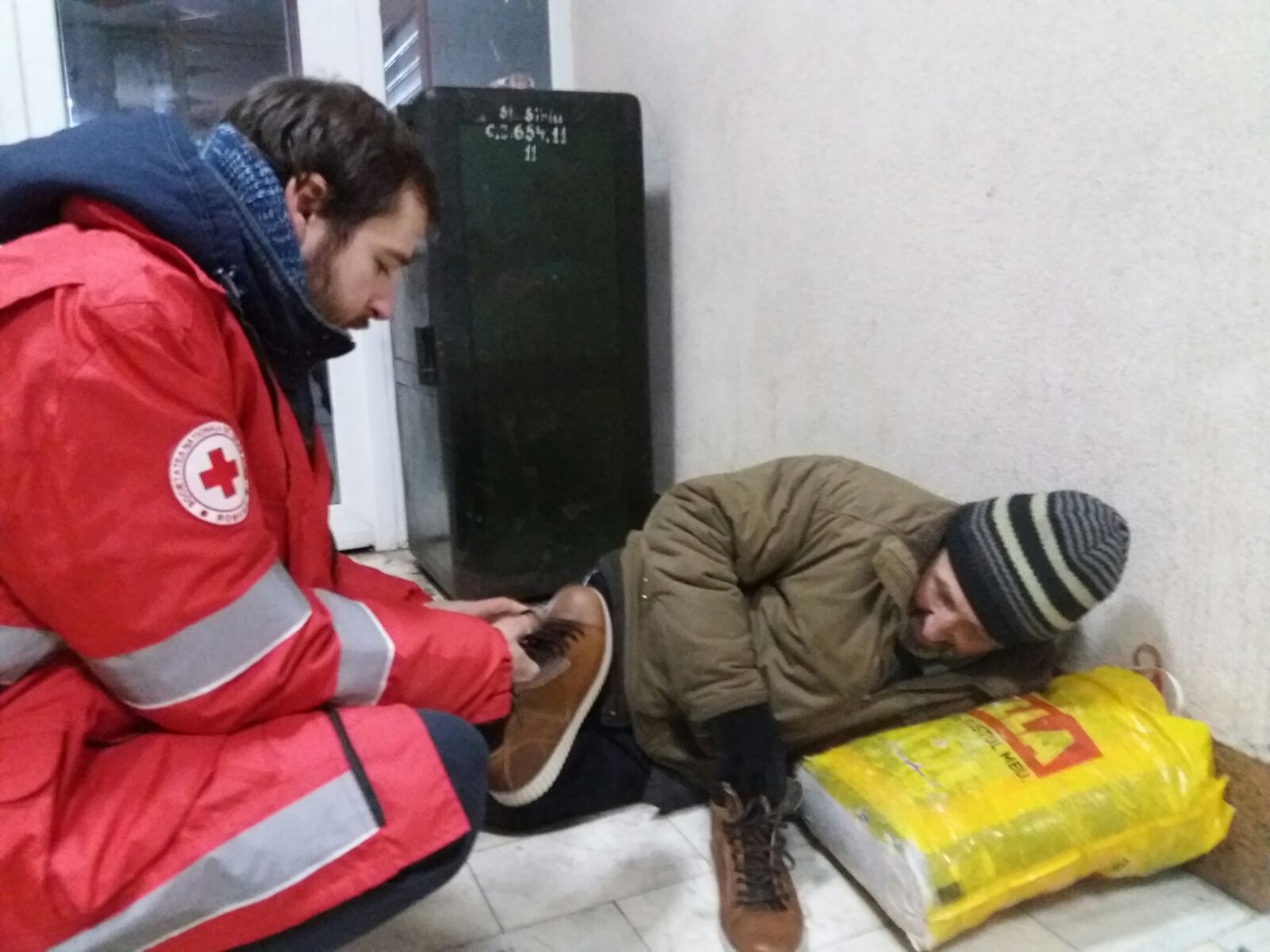 FOTO: Oamenii străzii au primit haine şi ceai de la poliţişti şi voluntari ai Crucii Roşii